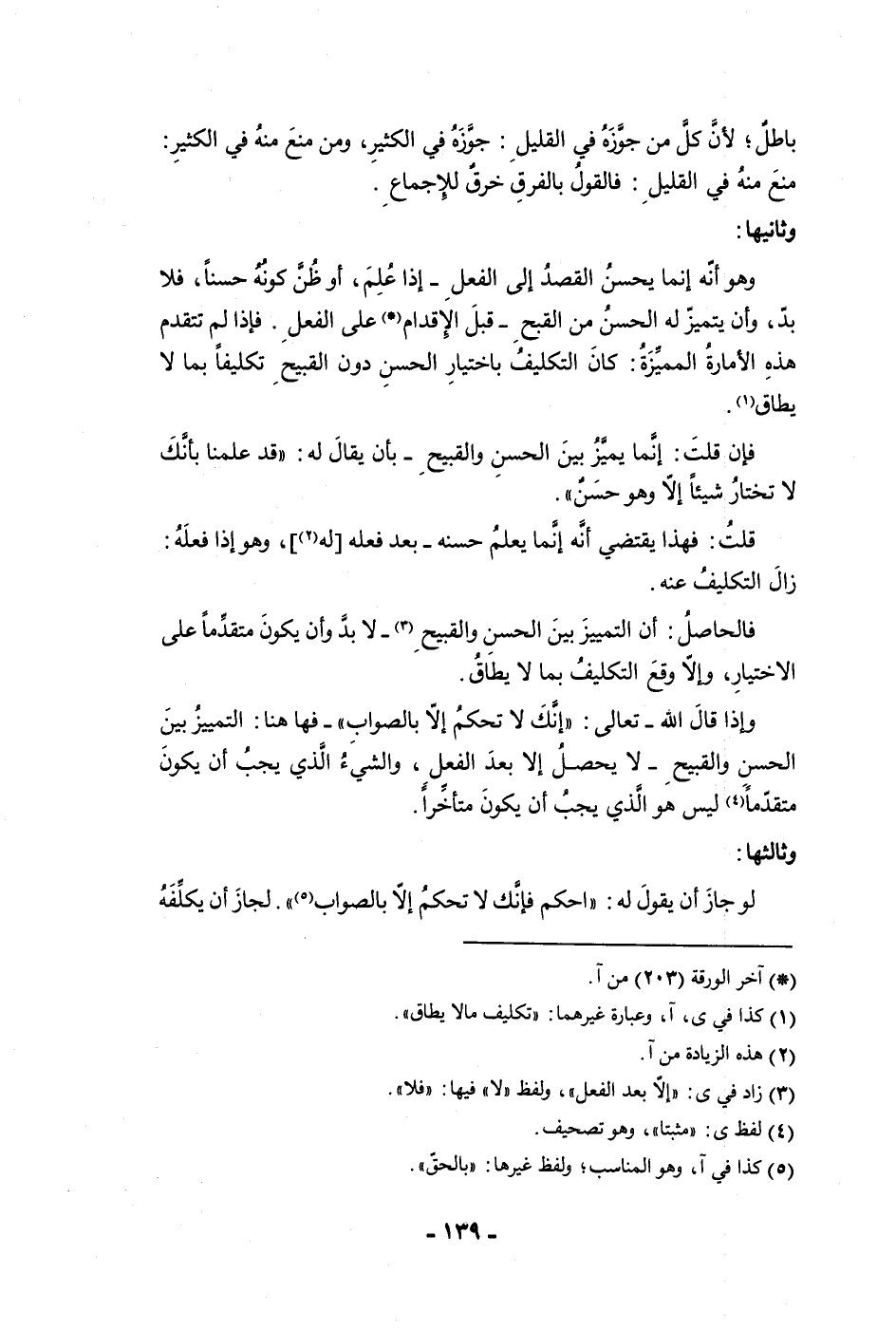 باطل لأن كل من جوزه في القليل جوزه في الكثير ومن منع منه في الكثير منع منه في القليل فالقول بالفرق خرق للإجماع وثانيها وهو أنه إنما يحسن القصد إلى الفعل إذا علم أو ظن كونه حسنا فلا بد وأن يتميز له الحسن من القبح قبل الإقدام على الفعل فإذا لم تتقدم هذه الأمارة المميزة كان التكليف باختيار الحسن دون القبيح تكليفا بما لا يطاق فإن قلت إنما يميز بين الحسن والقبيح بأن يقال له قد علمنا بأنك لا تختار شيئا إلا وهو حسن قلت فهذا يقتضي أنه إنما يعلم حسنه بعد فعله له وهو إذا فعله زال التكليف عنه فالحاصل أن التمييز بين الحسن والقبيح لا بد وأن يكون متقدما على الاختيار وإلا وقع التكليف بما لا يطاق وإذا قال الله تعالى إنك لا تحكم إلا بالصواب فها هنا التمييز بين