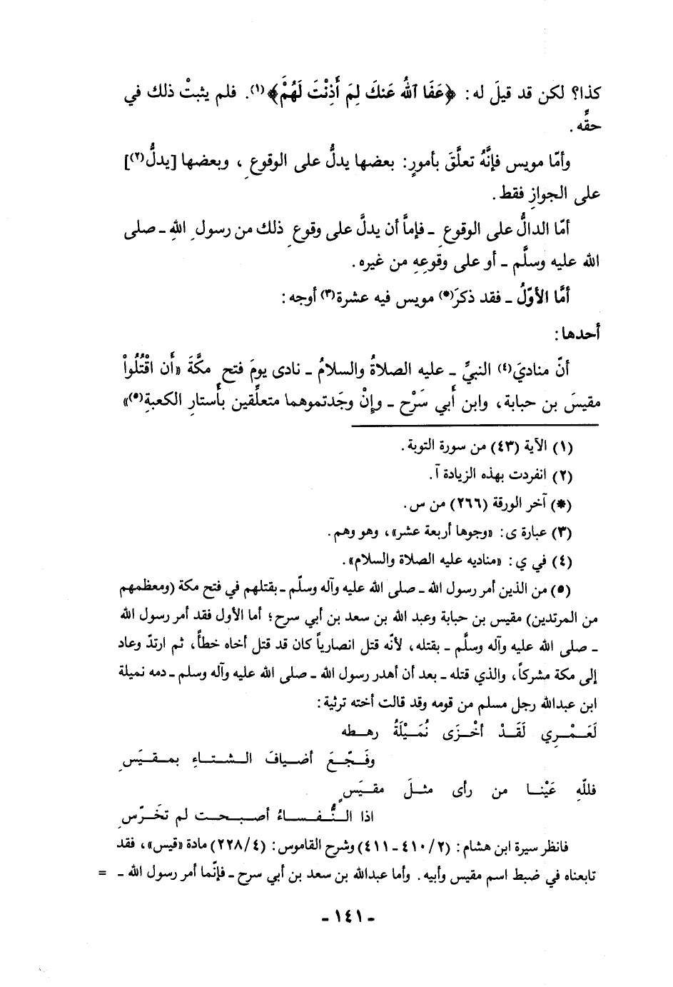 كذا لكن قد قيل له عفا الله عنك لم أذنت لهم فلم يثبت ذلك في حقه وأما مويس فإنه تعلق بأمور بعضها يدل على الواقع وبعضها يدل على الجواز فقط أما الدال على الوقوع فإما أن يدل على وقوع ذلك من رسول الله ص أو على وقوعه من غيره أما الأول فقد ذكر مويس فيه عشرة أوجه أحدها أن منادي النبي عليه الصلاة والسلام نادى يوم فتح مكة أن اقتلوا مقيس بن حبابة وابن أبي سرح وإن وجدتموهما متعلقين بأستار الكعبة