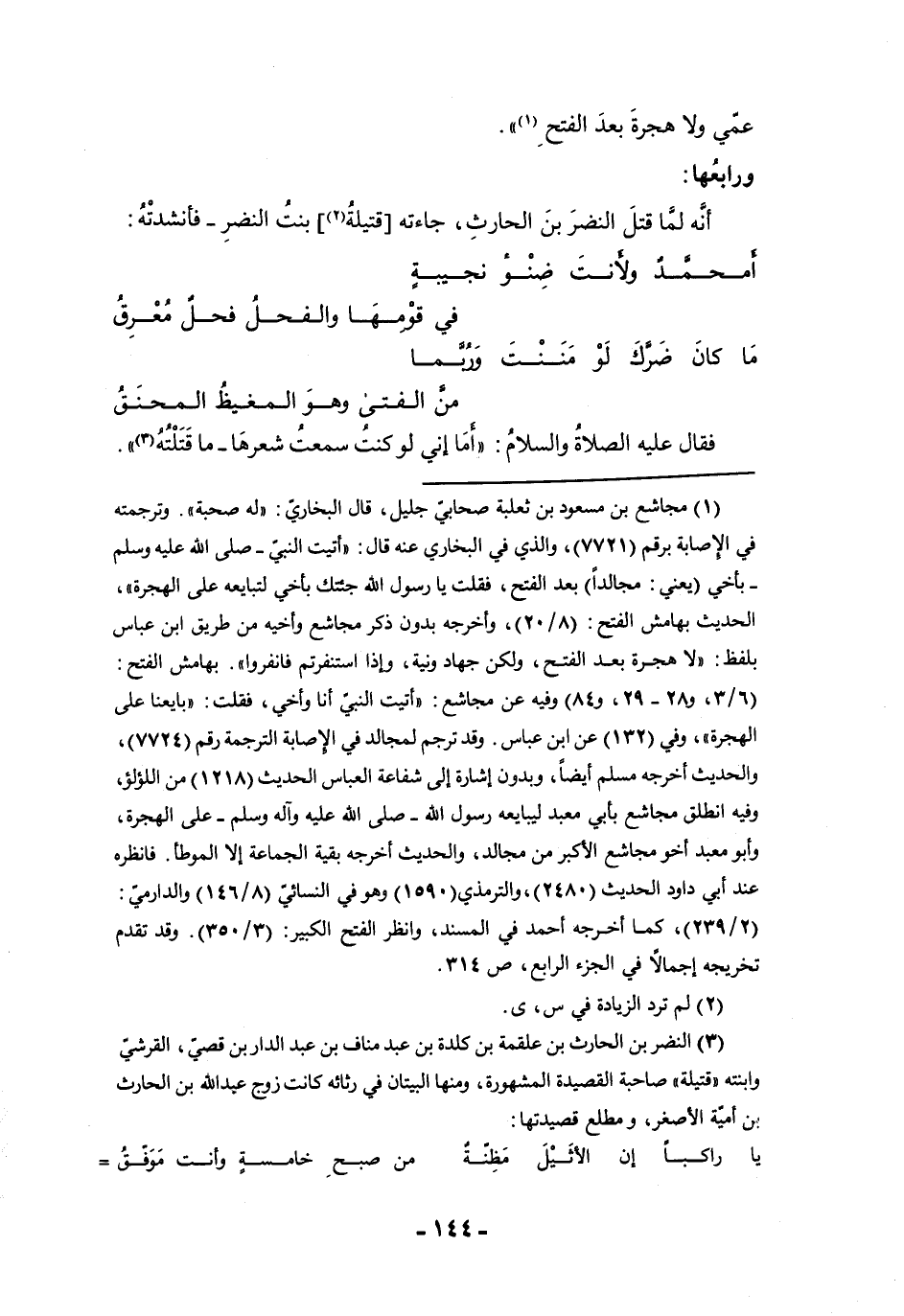 عمي ولا هجرة بعد الفتح ورابعها أنه لما قتل النضر بن الحارث جاءته قتيلة بنت النضر فأنشدته أمحمد ولأنت ضنؤ كل نجيبة في قومها والفحل فحل معرق ما كان ضرك لو مننت وربما من الفتى وهو المغيظ المحنق فقال عليه الصلاة والسلام أما أني لو كنت سمعت شعرها ما قتلته