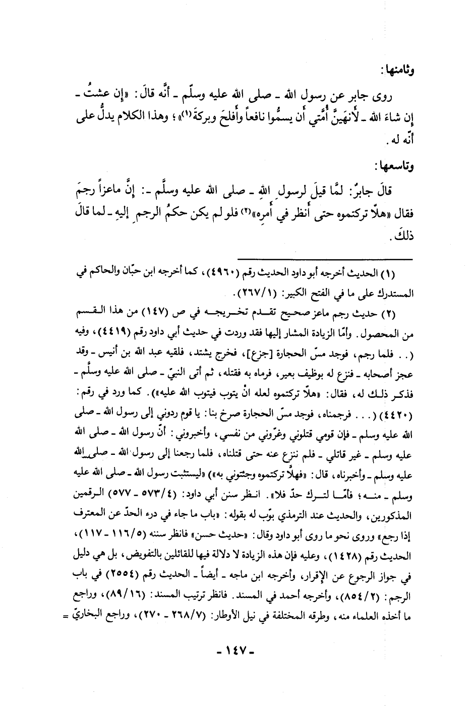 وثامنها روى جابر عن رسول الله ص أنه قال إن عشت إن شاء الله لأنهين أمتي أن يسموا نافعا وأفلح وبركة وهذا الكلام يدل على أنه له وتاسعها قال جابر لما قيل لرسول الله ص إن ماعزا رجم فقال هلا تركتموه حتى أنظر في أمره فلو لم يكن حكم الرجم إليه لما قال ذلك