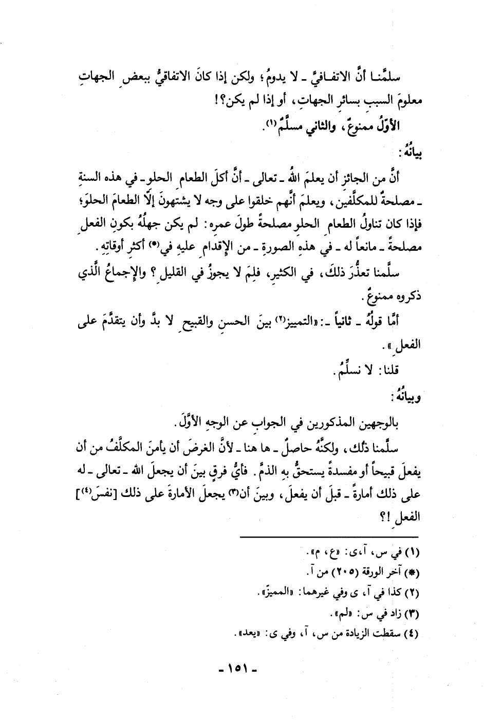 سلمنا أن الاتفاقي لا يدوم ولكن إذا كان الاتفاقي ببعض الجهات معلوم السبب بسائر الجهات أو إذا لم يكن الأول ممنوع والثاني مسلم بيانه أن من الجائز أن يعلم الله تعالى أن أكل الطعام الحلو في هذه السنة مصلحة للمكلفين ويعلم أنهم خلقوا على وجه لا يشتهون إلا الطعام الحلو فإذا كان تناول الطعام الحلو مصلحة طول عمره لم يكن جهله بكون الفعل مصلحة مانعا له في هذه الصورة من الإقدام عليه في أكثر أوقاته سلمنا تعذر ذلك في الكثير فلم لا يجوز في القليل والإجماع الذي ذكروه ممنوع أما قوله ثانيا التمييز بين الحسن والقبيح لابد وأن يتقدم على الفعل قلنا لا نسلم وبيانه بالوجهين المذكورين في الجواب عن الوجه الأول سلمنا ذلك ولكنه حاصل ها هنا لأن الغرض أن يأمن المكلف من أن