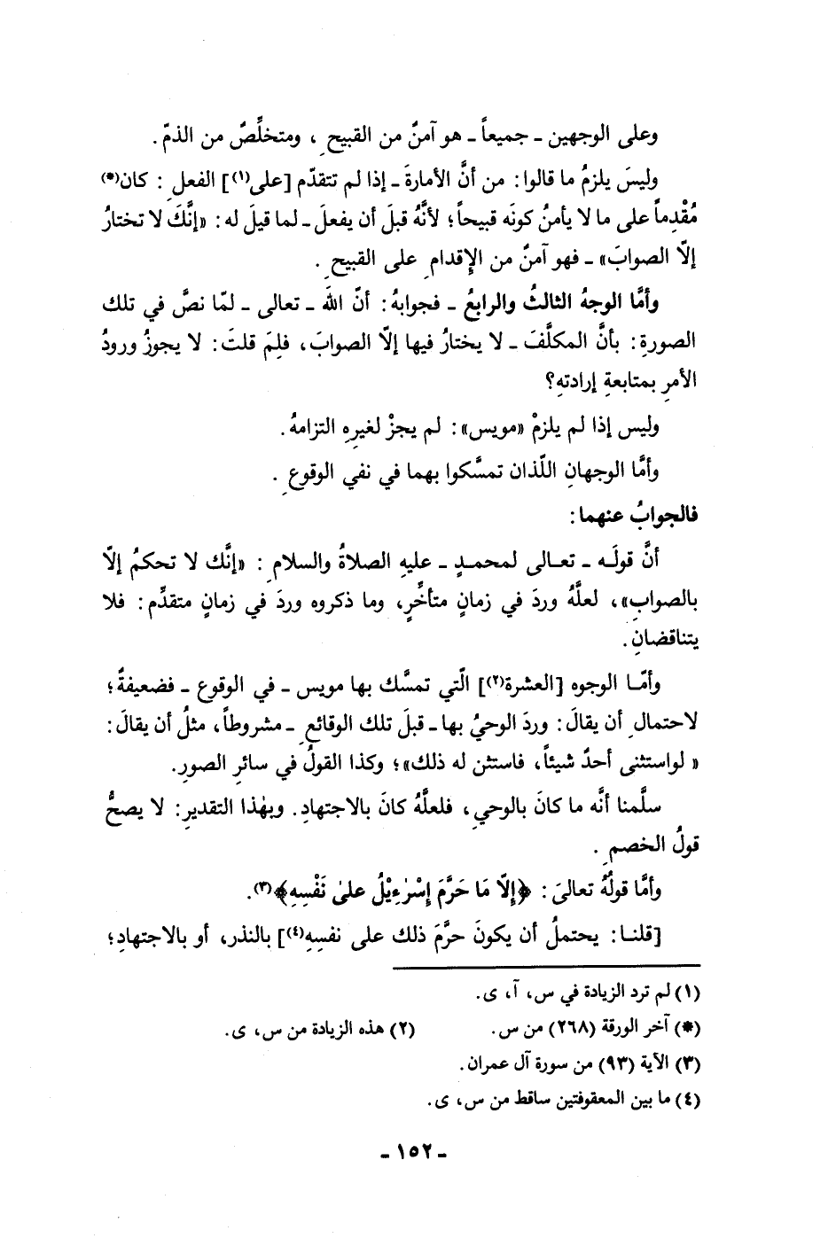 وعلى الوجهين جميعا هو آمن من القبيح ومتخلص من الذم وليس يلزم ما قالوا من أن الأمارة إذا لم تتقدم على الفعل كان مقدما على ما لا يأمن كونه قبيحا لأنه قبل أن يفعل لما قيل له إنك لا تختار إلا الصواب فهو آمن من الإقدام على القبيح وأما الوجه الثالث والرابع فجوابه أن الله تعالى لما نص في تلك الصورة بأن المكلف لا يختار فيها إلا الصواب فلم قلت لا يجوز ورود الأمر بمتابعة إرادته وليس إذا لم يلزم مويس لم يجز لغيره التزامه وأما الوجهان اللذان تمسكوا بهما في نفي الوقوع فالجواب عنهما أن قوله تعالى لمحمد عليه الصلاة والسلام إنك لا تحكم إلا بالصواب لعله ورد في زمان متأخر وما ذكروه ورد في زمان متقدم فلا يتناقضان وأما الوجوه العشرة التي تمسك بها مويس في الوقوع فضعيفة لاحتمال أن يقال ورد الوحي بها قبل تلك الوقائع مشروطا مثل أن يقال لو استثنى أحد شيئا فاستثن له ذلك وكذا القول في سائر الصور سلمنا أنه ما كان بالوحي فلعله كان بالاجتهاد وبهذا التقدير لا يصح قول الخصم