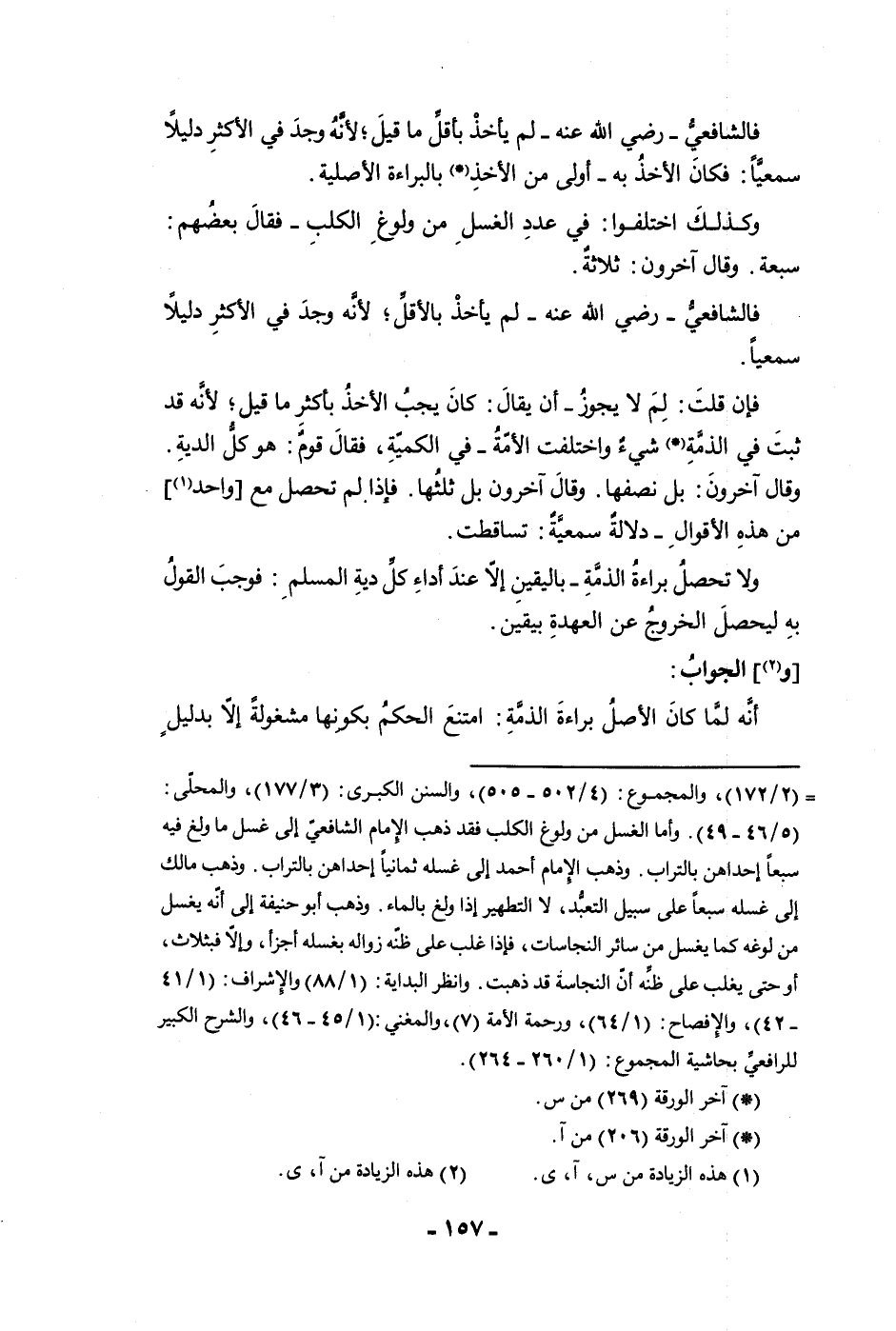فالشافعي رضي الله عنه لم يأخذ بأقل ما قيل لأنه وجد في الأكثر دليلا سمعيا فكان الأخذ به أولى من الأخذ بالبراءة الأصلية وكذلك اختلفوا في عدد الغسل من ولوغ الكلب فقال بعضهم سبعة وقال آخرون ثلاثة