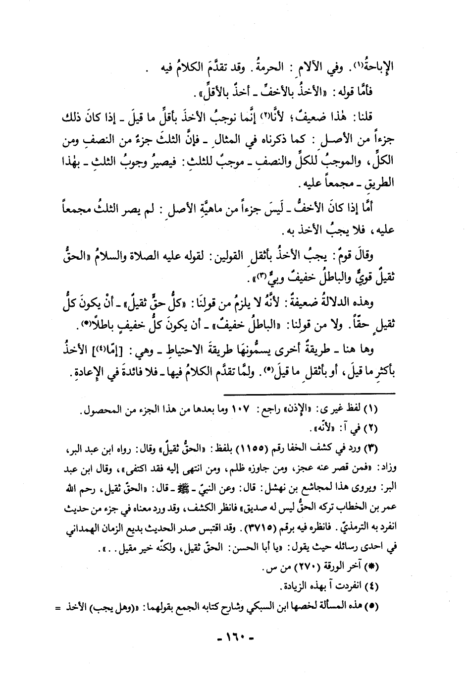 الطريق مجمعا عليه أما إذا كان الأخف ليس جزءا من ماهية الأصل لم يصر الثلث مجمعا عليه فلا يجب الأخذ به وقال قوم يجب الأخذ بأثقل القولين لقوله عليه الصلاة والسلام الحق ثقيل قوي والباطل خفيف وبي وهذه الدلالة ضعيفة لأنه لا يلزم من قولنا كل حق ثقيل أن يكون كل ثقيل حق ولا من قولنا الباطل خفيف أن يكون كل خفيف باطلا وها هنا طريقة أخرى يسمونها طريقة الاحتياط وهى إما الأخذ بأكثر ما قيل أو بأثقل ما قيل ولما تقدم الكلام فيها فلا فائدة في الإعادة