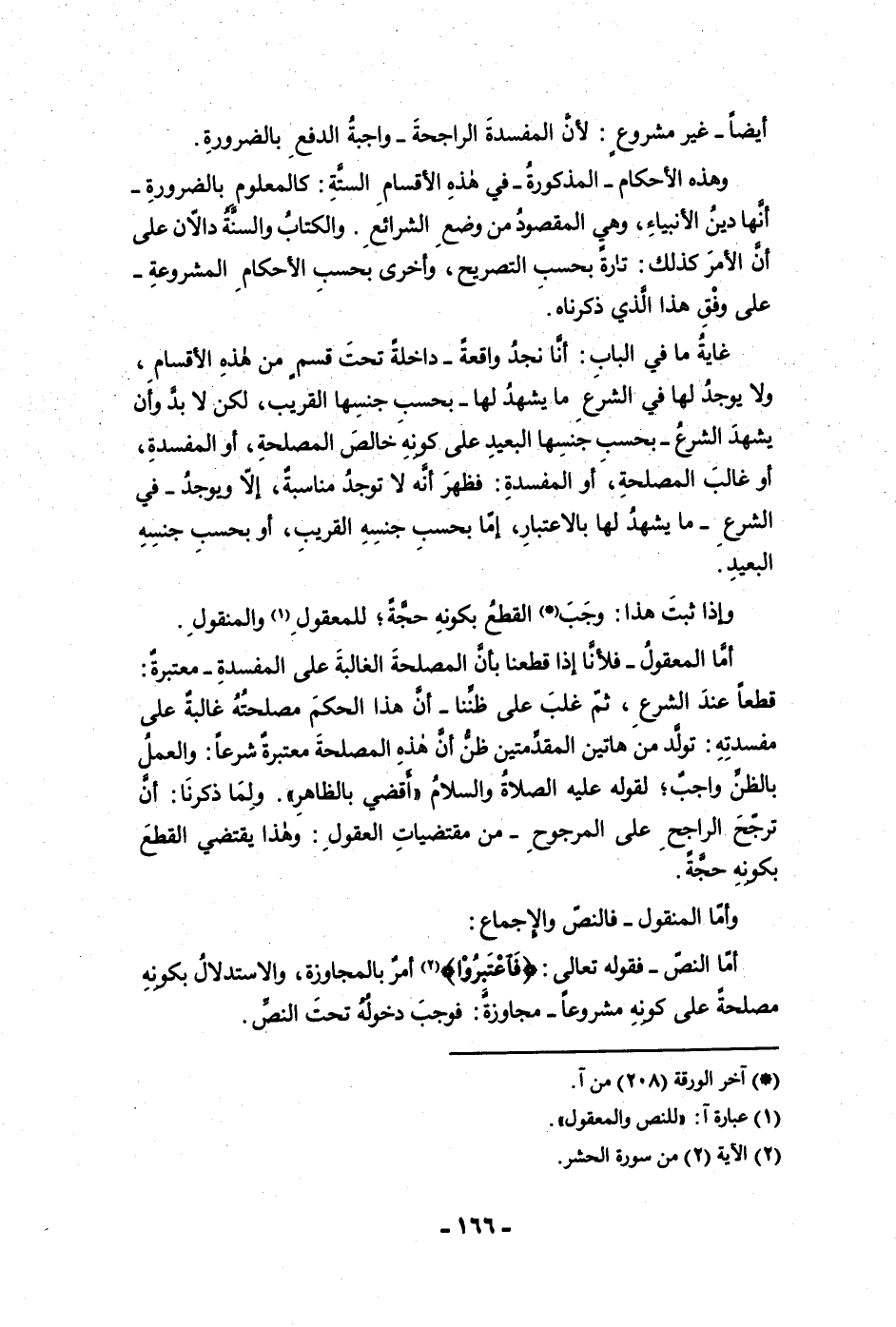 بكونه حجة وأما المنقول فالنص والإجماع أما النص فقوله تعالى فاعتبروا أمر بالمجاوزة والاستدلال بكونه مصلحة على كونه مشروعا مجاوزة فوجب دخوله تحت النص