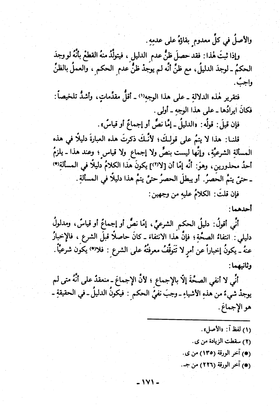 والأصل في كل معدوم بقاؤه على عدمه وإذا ثبت هذا فقد حصل ظن عدم الدليل فيتولد منه القطع بأنه لو وجد الحكم لوجد الدليل مع ظن أنه لم يوجد ظن عدم الحكم والعمل بالظن واجب فتقرير هذه الدلالة على هذا الوجه أقل مقدمات وأشد تلخيصا فكان ايرادها على هذا الوجه أولى فإن قيل قوله الدليل إما نص أو إجماع أو قياس قلنا هذا لا يتم على قولك لأنك ذكرت هذه العبارة دليلا في المسألة الشرعية وإنها ليست بنص ولا إجماع ولا قياس وعند هذا يلزم أحد محذورين وهو أنه إما أن لا يكون هذا الكلام دليلا في المسألة حتى يتم الحصر أو يبطل الحصر حتى يتم هذا دليلا في المسألة فإن قلت الكلام عليه من وجهين أحدهما أني أقول دليل الحكم الشرعي إما نص أو إجماع أو قياس ومدلول دليلي انتفاء الصحة فإن هذا الانتفاء كان حاصلا قبل الشرع فالإخبار عنه يكون إخبارا عن أمر لا تتوقف معرفته على الشرع فلا يكون شرعيا