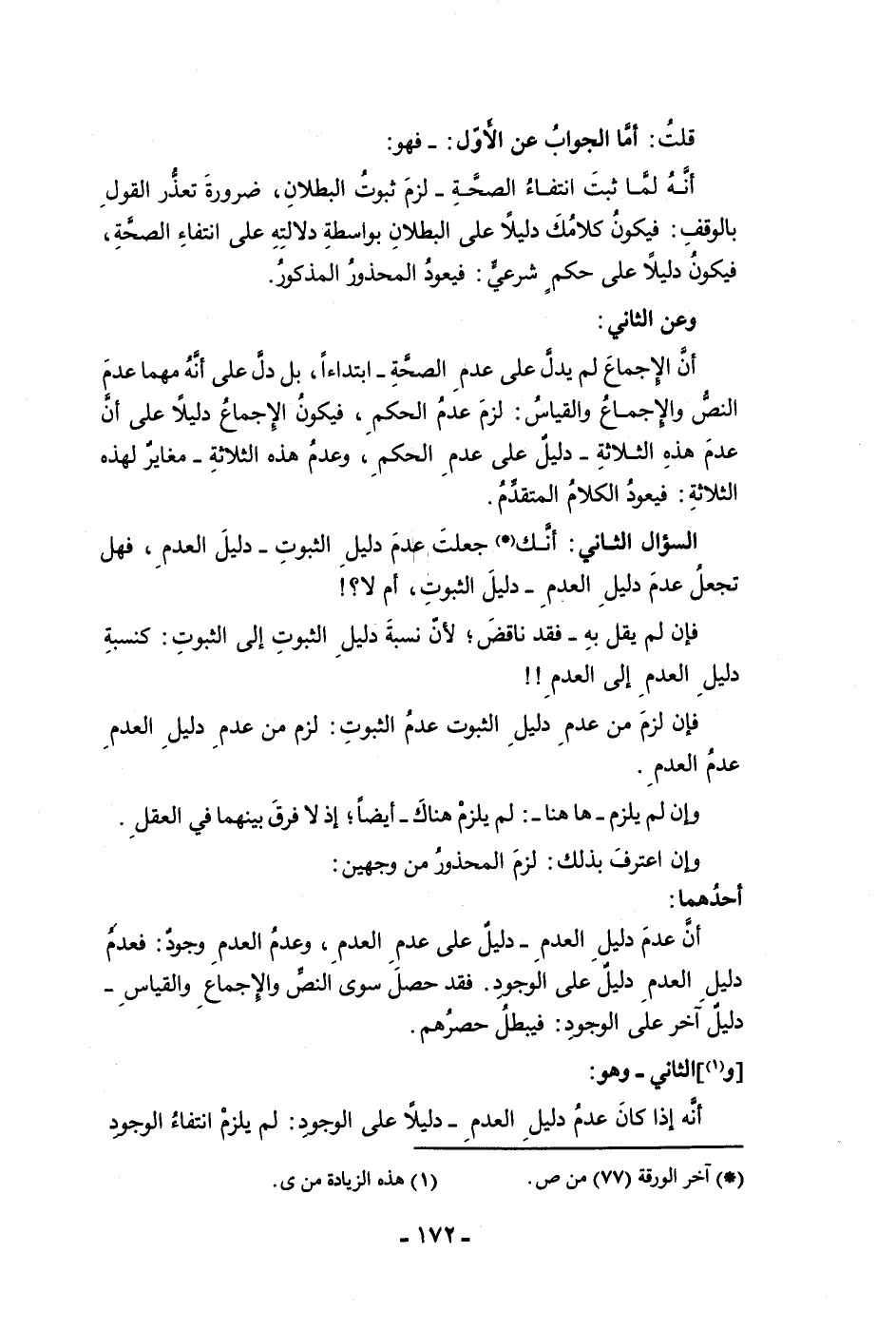 قلت أما الجواب عن الأول فهو أنه لما ثبت انتفاء الصحة لزم ثبوت البطلان ضرورة تعذر القول بالوقف فيكون كلامك دليلا على البطلان بواسطة دلالته على انتفاء الصحة فيكون دليلا على حكم شرعي فيعود المحذور المذكور وعن الثاني أن الإجماع لم يدل على عدم الصحة ابتداءا بل دل على أنه مهما عدم النص والإجماع والقياس لزم عدم الحكم فيكون الإجماع دليلا على أن عدم هذه الثلاثة دليل على عدم الحكم وعدم هذه الثلاثة مغاير لهذه الثلاثة فيعود الكلام المتقدم السؤال الثاني أنك جعلت عدم دليل الثبوت دليل العدم فهل تجعل عدم دليل العدم دليل الثبوت أم لا فإن لم يقل به فقد ناقض لأن نسبة دليل الثبوت إلى الثبوت كنسبة دليل العدم إلى العدم فإن لزم من عدم دليل الثبوت عدم الثبوت لزم من عدم دليل العدم عدم العدم وأن لم يلزم ها هنا لم يلزم هناك أيضا إذ لا فرق بينهما في العقل وإن اعترف بذلك لزم المحذور من وجهين