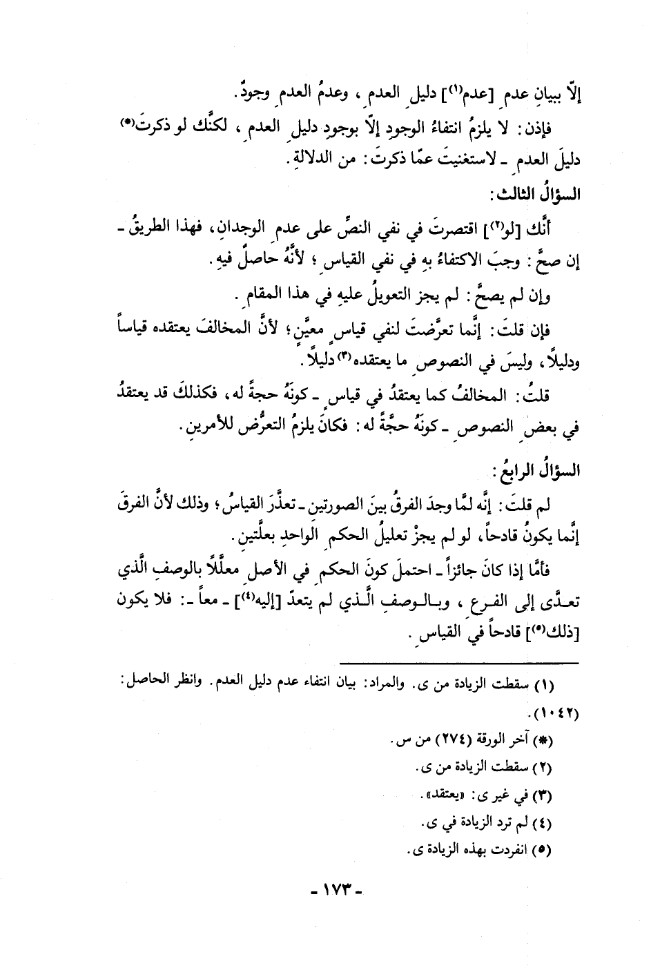 إلا ببيان عدم عدم دليل العدم وعدم العدم وجود فإذن لا يلزم انتفاء الوجود إلا بوجود دليل العدم لكنك لو ذكرت دليل العدم لاستغنيت عما ذكرت من الدلالة السؤال الثالث أنك لو اقتصرت في نفي النص على عدم الوجدان فهذا الطريق إن صح وجب الاكتفاء به في نفي القياس لأنه حاصل فيه وإن لم يصح لم يجز التعويل عليه في هذا المقام فإن قلت إنما تعرضت لنفي قياس معين لأن المخالف يعتقده قياسا ودليلا وليس في النصوص ما يعتقده دليلا قلت المخالف كما يعتقد في قياس كونه حجة له فكذلك قد يعتقد في بعض النصوص كونه حجة له فكان يلزم التعرض للأمرين السؤال الرابع لم قلت إنه لما وجد الفرق بين الصورتين تعذر القياس وذلك لأن الفرق إنما يكون قادحا لو لم يجز تعليل الحكم الواحد بعلتين فأما إذا كان جائزا احتمل كون الحكم في الأصل معللا بالوصف الذي
