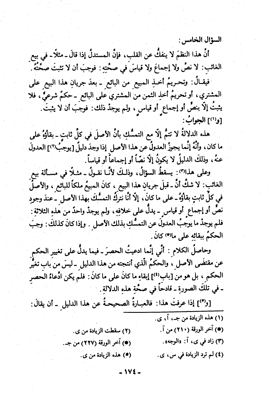 السؤال الخامس أن هذا النظم لا ينفك عن القلب فإن المستدل إذا قال مثلا في بيع الغائب لا نص ولا إجماع ولا قياس في صحته فوجب أن لا تثبت صحته فيقال وتحريم أخذ المبيع من البائع بعد جريان هذا البيع على المشتري أو تحريم أخذ الثمن من المشتري على البائع حكم شرعي فلا يثبت إلا بنص أو إجماع أو قياس ولم يوجد ذلك فوجب أن لا يثبت الجواب هذه الدلالة لا تتم إلا مع التمسك بأن الأصل في كل ثابت بقاؤه على ما كان وأنه إنما يجوز العدول عن هذا الأصل إذا وجد دليل يوجب العدول عنه وذلك الدليل لا يكون إلا نصا أو إجماعا أو قياسا وعلى هذا يسقط السؤال وذلك لأنا نقول مثلا في مسألة بيع الغائب لا شك أن قبل جريان هذا البيع كان المبيع ملكا للبائع والأصل في كل ثابت بقاؤه على ما كان إلا أنا نترك التمسك بهذا الأصل عند وجود نص أو إجماع أو قياس يدل على خلافه ولم يوجد واحد من هذه الثلاثة فلم يوجد ما يوجب العدول عن التمسك بذلك الأصل وإذا كان كذلك وجب الحكم ببقائه على ما كان وحاصل الكلام أنى إنما ادعيت الحصر فيما يدل على تغيير الحكم عن مقتضى الأصل والحكم الذي أنتجته من هذا الدليل ليس من باب تغير الحكم بل هو من باب إبقاء ما كان على ما كان فلم يكن ادعاء الحصر