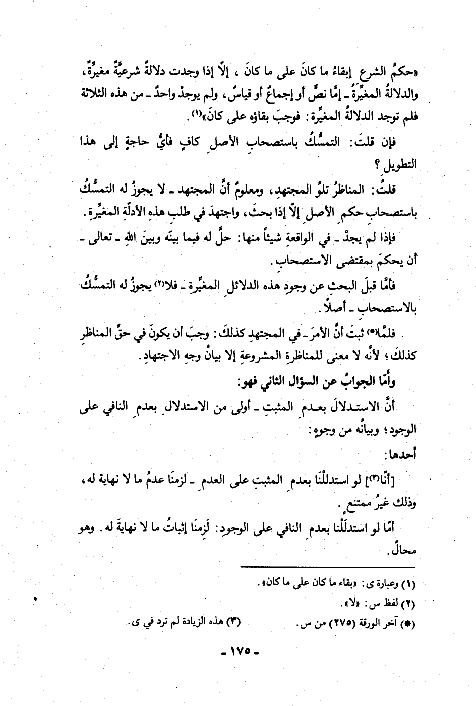 حكم الشرع إبقاء ما كان على ما كان إلا إذا وجدت دلالة شرعية مغيرة والدلالة المغيرة إما نص أو إجماع أو قياس ولم يوجد واحد من هذه الثلاثة فلم توجد الدلالة المغيرة فوجب بقاؤه على ما كان فإن قلت التمسك باستصحاب الأصل كاف فأي حاجة إلى هذا التطويل قلت المناظر تلو المجتهد ومعلوم أن المجتهد لا يجوز له التمسك باستصحاب حكم الأصل إلا إذا بحث واجتهد في طلب هذه الأدلة المغيرة فإذا لم يجد في الواقعة شيئا منها حل له فيما بينه وبين الله تعالى أن يحكم بمقتضى الاستصحاب فأما قبل البحث عن وجود هذه الدلائل المغيرة فلا يجوز له التمسك بالاستصحاب أصلا فلما ثبت أن الأمر في المجتهد كذلك وجب أن يكون في حق المناظر كذلك لأنه لا معنى للمناظرة المشروعة إلا بيان وجه الاجتهاد وأما الجواب عن السؤال الثاني فهو أن الاستدلال بعدم المثبت أولى من الاستدلال بعدم النافي على الوجود وبيانه من وجوه أحدها أنا لو استدللنا بعدم المثبت على العدم لزمنا عدم ما لا نهاية له وذلك غير ممتنع