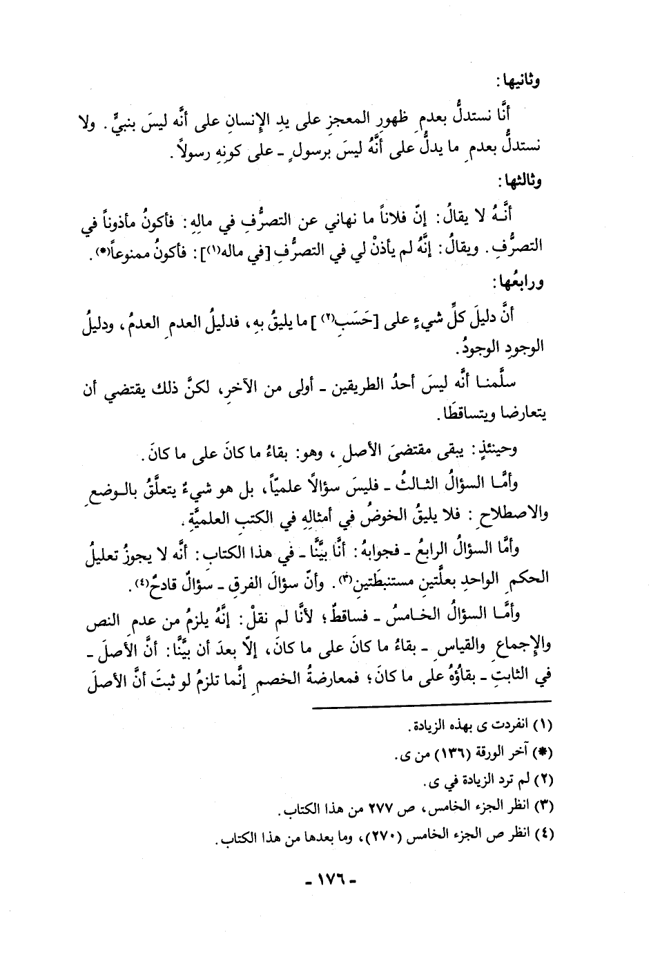 وثانيها أنا نستدل بعدم ظهور المعجز على يد الإنسان على أنه ليس بنبي ولا نستدل بعدم ما يدل على أنه ليس برسول على كونه رسولا وثالثها أنه لا يقال أن فلانا ما نهاني عن التصرف في ماله فأكون مأذونا في التصرف ويقال إنه لم يأذن لي في التصرف في ماله فأكون ممنوعا ورابعها أن دليل كل شئ على حسب ما يليق به فدليل العدم العدم ودليل الوجود الوجود سلمنا أنه ليس أحد الطريقين أولى من الآخر لكن ذلك يقتضي أن يتعارضا ويتساقطا منه وحينئذ يبقى مقتضى الأصل وهو بقاء ما كان على ما كان وأما السؤال الثالث فليس سؤالا علميا بل هو شئ يتعلق بالوضع والاصطلاح فلا يليق الخوض في أمثاله في الكتب العلمية وأما السؤال الرابع فجوابه أنا بينا في هذا الكتاب أنه لا يجوز تعليل الحكم الواحد بعلتين مستنبطتين وأن سؤال الفرق سؤال قادح وأما السؤال الخامس فساقط لأنا لم نقل إنه يلزم من عدم النص والإجماع والقياس بقاء ما كان على ما كان إلا بعد أن بينا أن الأصل في الثابت بقاؤه على ما كان فمعارضة الخصم إنما تلزم لو ثبت أن الأصل