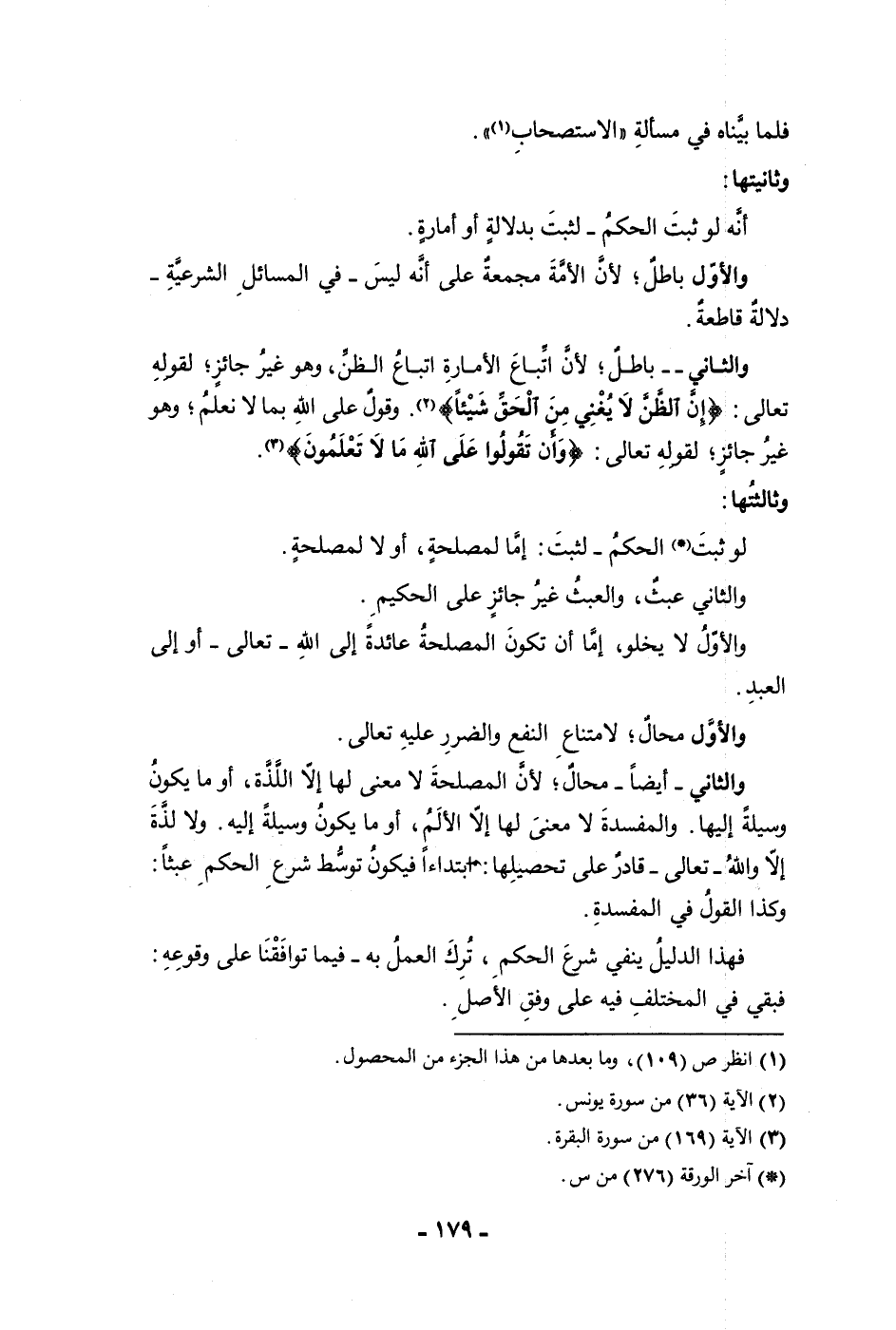 وثانيتها أنه لو ثبت الحكم لثبت بدلالة أو أمارة والأول باطل لأن الأمة مجمعة على أنه ليس في المسائل الشرعية دلالة قاطعة والثاني أيضا باطل لأن اتباع الأمارة اتباع الظن وهو غير جائز لقوله تعالى إن الظن لا يغني من الحق شيئا وقول على الله بما لا نعلم وهو غير جائز لقوله تعالى وأن تقولوا على الله مالا تعلمون وثالتها لو ثبت الحكم لثبت إما لمصلحة أو لا لمصلحة والثاني عبث والعبث غير جائز على الحكيم والأول لا يخلو إما أن تكون المصلحة عائدة إلى الله تعالى أو إلى العبد والأول محال لامتناع النفع والضرر عليه تعالى والثاني أيضا محال لأن المصلحة لا معنى لها إلا اللذة أو ما يكون وسيلة إليها والمفسدة لا معنى لها إلا الألم أو ما يكون وسيلة إليه ولا لذة إلا والله تعالى قادر على تحصيلها إبتداءا فيكون توسط شرع الحكم عبثا وكذا القول في المفسدة فهذا الدليل ينفي شرع الحكم ترك العمل به فيما توافقنا على وقوعه فبقي في المختلف فيه على وفق الأصل
