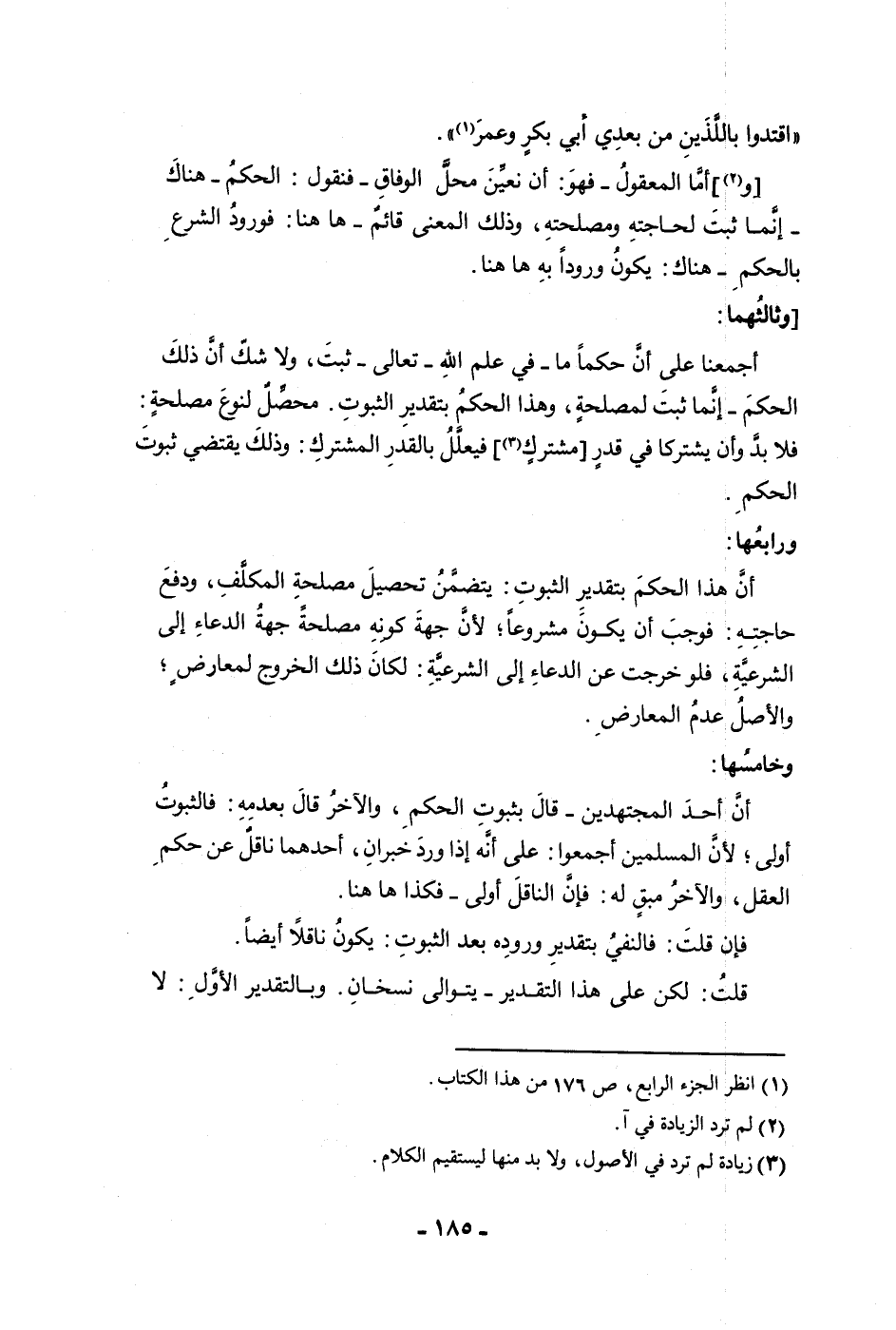 اقتدوا بالذين من بعدي أبي بكر وعمر ووأما: المقول فهو أن نعين محل الوفاق فنقول الحكم هناك إنما ثبت لحاجته ومصلحته وذلك المعنى قائم هاهنا فورود الشرع بالحكم هناك يكون ورودا به هاهنا وثالثها