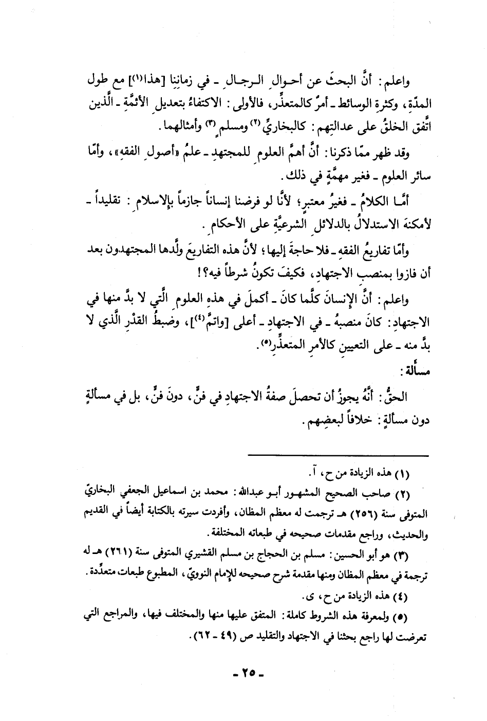 واعلم أن البحث عن أحوال الرجال في زماننا هذا مع طول المدة وكثرة الوسائط أمر كالمتعذر فالأولى الاكتفاء بتعديل الأئمة الذين اتفق الخلق على عدالتهم كالبخاري ومسلم وأمثالهما وقد ظهر مما ذكرنا أن أهم العلوم للمجتهد علم أصول الفقه وأما سائر العلوم فغير مهمة في ذلك أما الكلام فغير معتبر لأنا لو فرضنا إنسانا جازما بالإسلام تقليدا لأمكنه الاستدلال بالدلائل الشرعية على الأحكام وأما تفاريع الفقه فلا حاجة إليها لأن هذه التفاريع ولدها المجتهدون بعد أن فازوا بمنصب الاجتهاد فكيف تكون شرطا فيه
