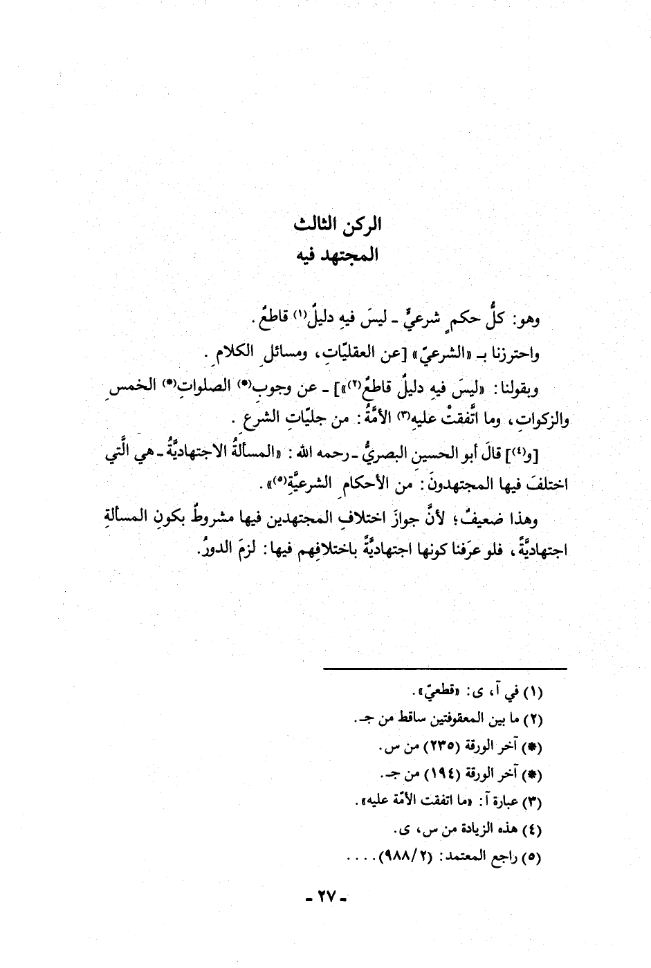 الركن الثالث المجتهد فيه وهو كل حكم شرعي ليس فيه دليل قاطع واحترزنا ب الشرعي عن العقليات ومسائل الكلام وبقولنا ليس فيه دليل قاطع عن وجوب الصلوات الخمس والزكوات وما اتفقت عليه الأمة من جليات الشرع وقال أبو الحسين البصري رحمه الله المسألة الاجتهادية هي التي