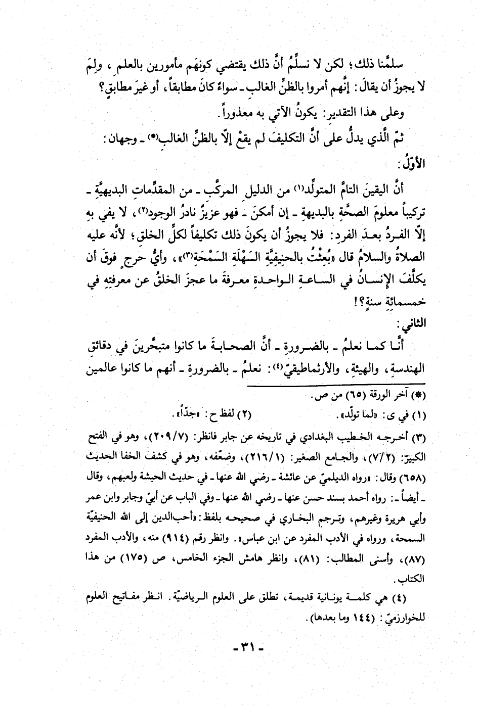 خمسمائة سنة الثاني أنا كما نعلم بالضرورة أن الصحابة ما كانوا متبحرين في دقائق الهندسة والهيئة والأرثماطيقى روى نعلم بالضرورة أنهم ما كانوا عالمين