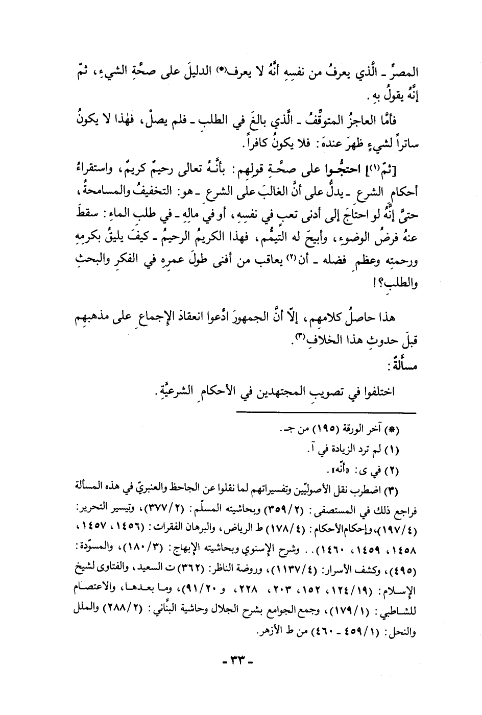 المصر الذي يعرف من نفسه أنه لا يعرف الدليل على صحة الشئ ثم إنه يقول به فأما العاجز المتوقف الذي بالغ في الطلب فلم يصل فهذا لا يكون ساترا لشئ ظهر عنده فلا يكون كافرا ثم احتجوا على صحة قولهم بأنه تعالى رحيم كريم واستقراء أحكام الشرع يدل على أن الغالب على الشرع هو التخفيف والمسامحة حتى إنه لو احتاج إلى أدنى تعب في نفسه أو في ماله في طلب الماء سقط عنه فرض الوضوء وأبيح له التيمم فهذا الكريم الرحيم كيف يليق بكرمه ورحمته وعظم فضله أن يعاقب من أفنى طول عمره في الفكر والبحث والطلب هذا حاصل كلامهم إلا أن الجمهور ادعوا انعقاد الإجماع على مذهبهم قبل حدوث هذا الخلاف مسألة اختلفوا في تصويب المجتهدين في الأحكام الشرعية