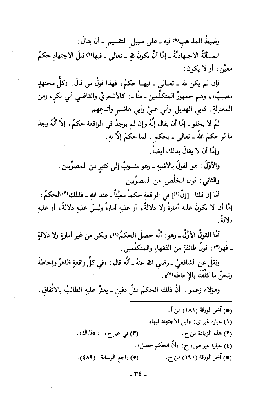 مصيب وهم جمهور المتكلمين منا كالأشعري والقاضي أبي بكر ومن المعتزلة كأبي الهذيل وأبي علي وأبي هاشم وأتباعهم ثم لا يخلو إما أن يقال إنه وإن لم يوجد في الواقعة حكم إلا إنه وجد ما لو حكم الله تعالى بحكم لما حكم إلا به وأما أن لا يقال بذلك أيضا والأول هو القول بالأشبه وهو منسوب إلى كثير من المصوبين والثاني قول الخلص من المصوبين أما إن قلنا إن في الواقعة حكما معينا عند الله فذلك الحكم إما أن لا يكون عليه إمارة ولا دلالة أو عليه إمارة وليس عليه دلالة أو عليه دلالة أما القول الأول وهو أنه حصل الحكم ولكن من غير أمارة ولا دلالة فهو قول طائفة من الفقهاء والمتكلمين ونقل عن الشافعي رضي الله عنه أنه قال في كل واقعة ظاهر وإحاطة ونحن ما كلفنا بالإحاطة وهؤلاء زعموا أن ذلك الحكم مثل دفين يعثر عليه الطالب بالاتفاق