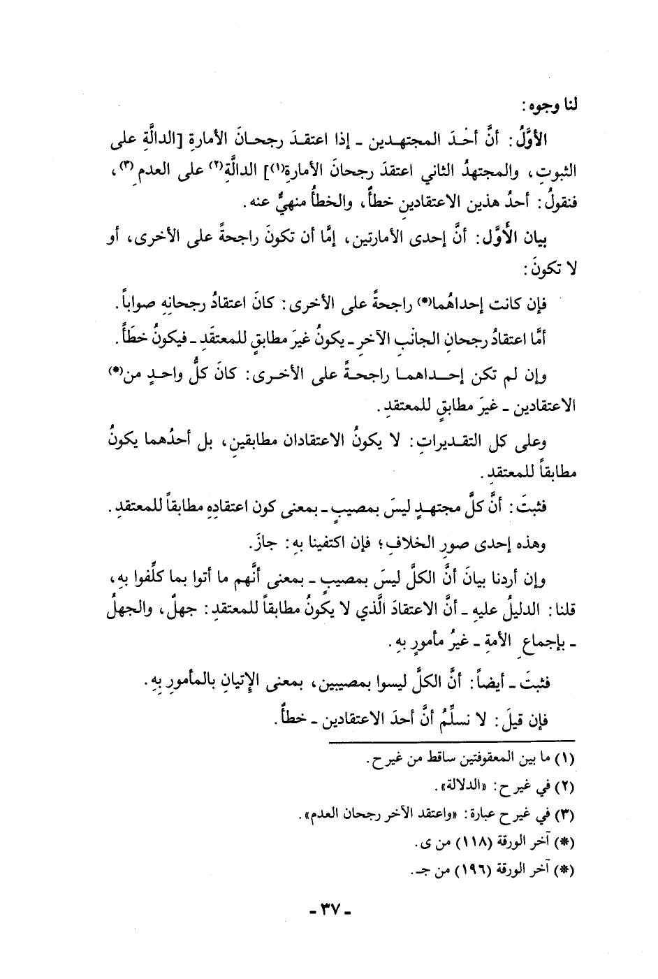 لنا وجوه الأول أن أحد المجتهدين إذا اعتقد رجحان الأمارة الدالة على الثبوت والمجتهد الثاني اعتقد رجحان الأمارة الدالة على العدم فنقول أحد هذين الاعتقادين خطأ والخطأ منهي عنه بيان الأول أن إحدى الأمارتين إما أن تكون راجحة على الأخرى أو لا تكون فان كانت إحداهما راجحة على الأخرى كان اعتقاد رجحانه صوابا أما اعتقاد رجحان الجانب الآخر يكون غير مطابق للمعتقد فيكون خطأ وإن لم تكن إحداهما راجحة على الأخرى كان كل واحد من الاعتقادين غير مطابق للمعتقد وعلى كل التقديرات لا يكون الإعتقادان ولم مطابقين بل أحدهما يكون مطابقا للمعتقد فثبت أن كل مجتهد ليس بمصيب بمعنى كون اعتقاده مطابقا للمعتقد وهذه إحدى صور الخلاف فإن اكتفينا به جاز وإن أردنا بيان أن الكل ليس بمصيب بمعنى أنهم ما أتوا بما كلفوا به قلنا الدليل عليه أن الاعتقاد الذي لا يكون مطابقا للمعتقد جهل والجهل بإجماع الأمة غير مأمور به فثبت أيضا أن الكل ليسوا بمصيبين بين بمعنى الإتيان بالمأمور به فإن قيل لا نسلم أن أحد الاعتقادين خطأ