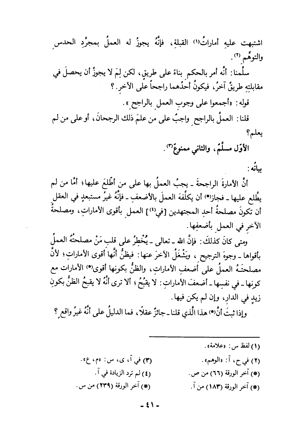 قوله أجمعوا على وجوب العمل بالراجح قلنا العمل بالراجح واجب على من علم ذلك الرجحان أو على من لم يعلم الأول مسلم والثاني ممنوع بيانه أن الأمارة الراجحة يجب العمل بها على من اطلع عليها أما من لم يطلع عليها فجاز أن يكلفه العمل بالأضعف فإنه غير مستبعد في العقل أن تكون مصلحة أحد المجتهدين في العمل بأقوى الأمارات ومصلحة الآخر في العمل بأضعفها أهل ومتى كان ذلك فإن الله تعالى يخطر على قلب من مصلحته العمل بأقواها وجوه الترجيح ويشغل الآخر عنها فيظن أنها أقوى الأمارات لأن مصلحته العمل على أضعف الأمارات والظن بكونها أقوى الأمارات مع كونها في نفسها أضعف الأمارات لا يقبح ألا ترى أنه لا يقبح الظن بكون زيد في الدار وإن لم يكن فيها وإذا ثبت أن هذا الذي قلنا جائز عقلا فما الدليل على أنه غير واقع