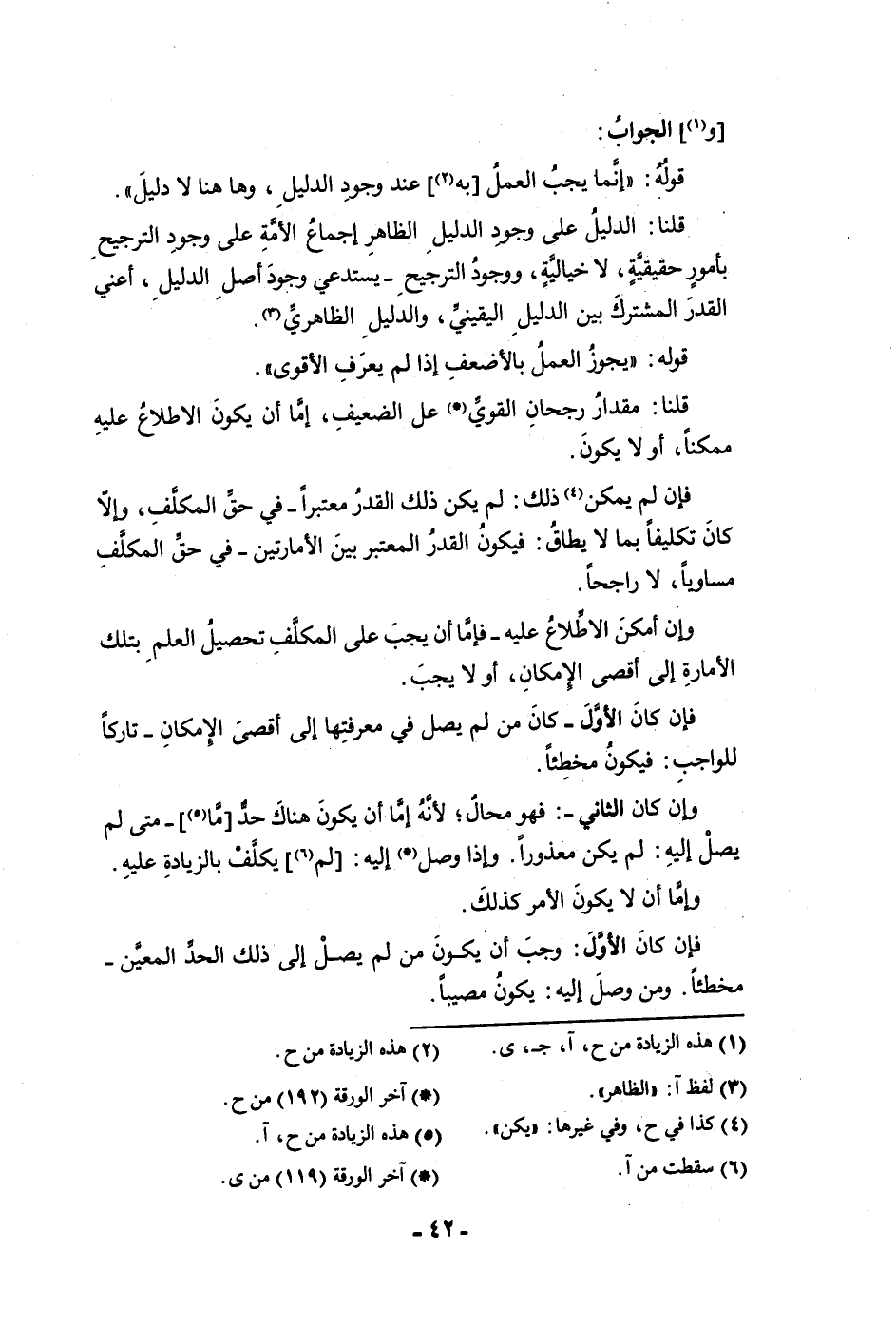 قلنا مقدار رجحان القوي على الضعيف أما أن يكون الاطلاع عليه ممكنا أو لا يكون فإن لم يكن ذلك لم يكن ذلك القدر معتبرا في حق المكلف وإلا كان تكليفا بما لا يطاق فيكون القدر المعتبر بين الأمارتين في حق المكلف مساويا لا راجحا وإن أمكن الاطلاع عليه فإما أن يجب على المكلف تحصيل العلم بتلك الأمارة إلى أقصى الإمكان أو لا يجب فإن كان الأول كان من لم يصل في معرفتها إلى أقصى الإمكان تاركا للواجب فيكون مخطئا وإن كان الثاني فهو محال لأنه إما أن يكون هناك حد ما متى لم يصل إليه لم يكن معذورا وإذا وصل إليه لم يكلف بالزيادة عليه وإما أن لا يكون الأمر كذلك فان كان الأول وجب أن يكون من لم يصل إلى ذلك الحد المعين مخطئا ومن وصل إليه يكون مصيبا