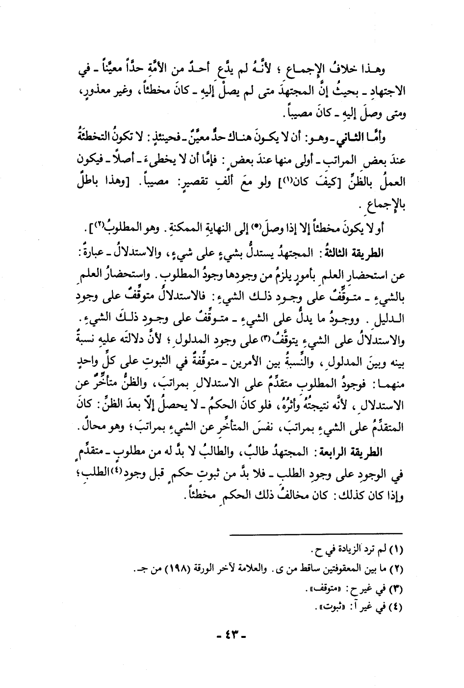 وهذا خلاف الإجماع لأنه لم يدع أحد من الأمة حدا معينا في الاجتهاد بحيث أن المجتهد متى لم يصل إليه كان مخطئا وغير معذور ومتى وصل إليه كان مصيبا وأما الثاني وهو أن لا يكون هناك حد معين فحينئذ لا تكون التخطئة عند بعض المراتب أولى منها عند بعض فإما أن لا يخطئ أصلا فيكون العمل بالظن كيف كان ولو مع ألف تقصير مصيبا وهذا باطل في الإجماع