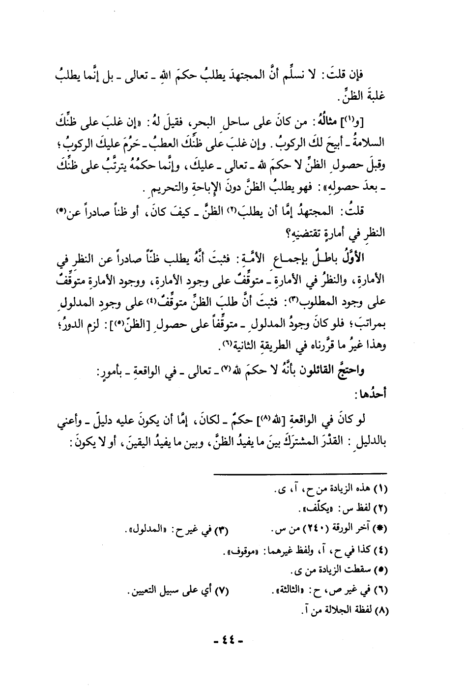 فان قلت لا نسلم أن المجتهد يطلب حكم الله تعالى بل إنما يطلب غلبة الظن ومثاله من كان على ساحل البحر فقيل له إن غلب على ظنك السلامة أبيح لك الركوب وإن غلب على ظنك العطب حرم عليك الركوب وقبل حصول الظن لا حكم لله تعالى عليك وإنما حكمه يترتب على ظنك بعد حصوله فهو يطلب الظن دون الإباحة والتحريم قلت المجتهد أما أن يطلب الظن كيف كان أو ظنا صادرا عن النظر في أمارة تقتضيه