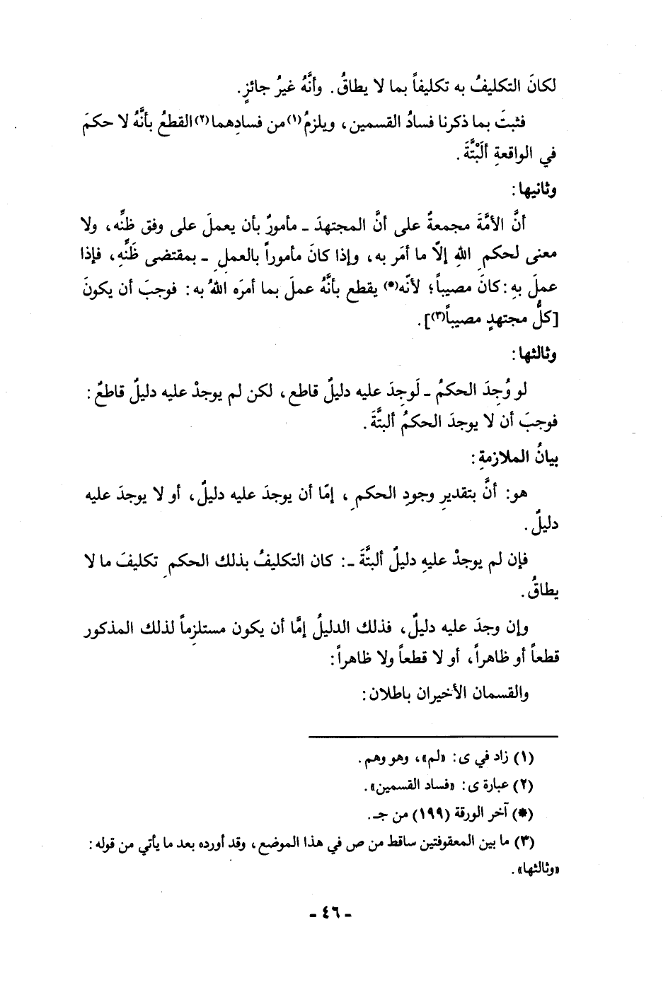 لكان التكليف به تكليفا بما لا يطاق وإنه غير جائز فثبت بما ذكرنا فساد القسمين ويلزم من فسادهما القطع بأنه لا حكم في الواقعة ألبتة وثانيها أن الأمة مجمعة على أن المجتهد مأمور بأن يعمل على وفق ظنه ولا معنى لحكم الله إلا ما أمر به وإذا كان مأمورا بالعمل بمقتضى ظنه فإذا عمل به كان مصيبا لأنه يقطع بأنه عمل بما أمره الله به فوجب أن يكون كل مجتهد مصيبا وثالثها لو وجد الحكم لوجد عليه دليل قاطع لكن لم يوجد عليه دليل قاطع فوجب أن لا يوجد الحكم ألبتة بيان الملازمة هو أن بتقدير وجود الحكم إما أن يوجد عليه دليل أو لا يوجد عليه دليل فإن لم يوجد عليه دليل ألبتة كان التكليف بذلك الحكم تكليف ما لا يطاق وأن وجد عليه دليل فذلك الدليل إما أن يكون مستلزما لذلك المذكور