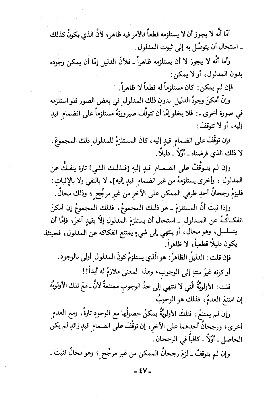 أما أنه لا يجوز أن لا يستلزمه قطعا فالأمر فيه ظاهر لأن الذي يكون كذلك استحال أن يتوصل به إلى ثبوت المدلول وأما أنه لا يجوز لا أن يستلزمه ظاهرا فلأن هذا الدليل إما أن يمكن وجوده بدون المدلول أو لا يمكن فإن لم يمكن كان مستلزما له قطعا لا ظاهرا وإن أمكن وجود الدليل بدون ذلك المدلول في بعض الصور فلو استلزمه في صورة أخرى فلا يخلو إما أن تتوقف صيرورته مستلزما على انضمام قيد إليه أو لا تتوقف فإن توقف على انضمام قيد إليه كان المستلزم للمدلول ذلك المجموع لا ذلك الذي فرضناه أولا دليلا وإن لم يتوقف على انضمام قيد إليه فذلك الشئ تارة ينفك عن المدلول وأخرى يستلزمه من غير انضمام قيد إليه لا بالنفي ولا بالإثبات فيلزم رجحان أحد طرفي الممكن على الآخر من غير مرجح وذلك محال وإذا ثبت أن المستلزم هو ذلك المجموع فذلك المجموع إن أمكن انفكاكه عن المدلول استحال أن يستلزم المدلول إلا بقيد آخر فإما أن يتسلسل وهو محال أو ينتهي إلى شئ يمتنع انفكاكه عن المدلول فحينئذ يكون دليلا قطعيا لا ظاهرا فإن قلت الدليل الظاهر هو الذي يستلزم كون المدلول أولى بالوجود أو كونه غير منته إلى الوجوب وهذا المعنى ملازم له أبدا