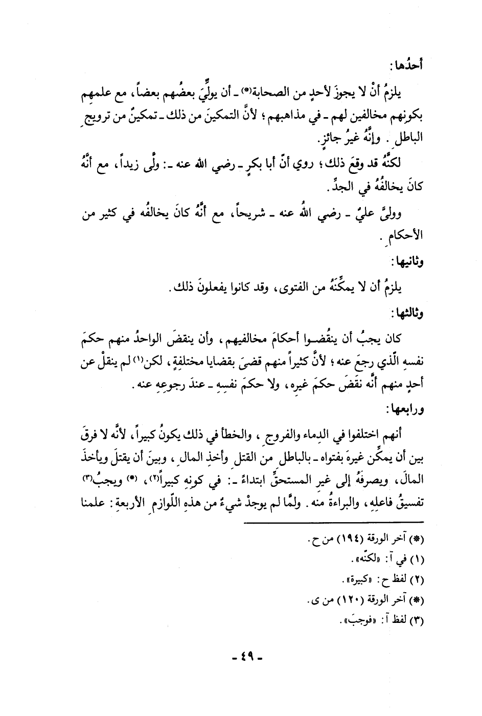 الأحكام وثانيها يلزم أن لا يمكنه من الفتوى وقد كانوا يفعلون ذلك وثالثها كان يجب أن ينقضوا أحكام مخالفيهم وأن ينقض الواحد منهم حكم نفسه الذي رجع عنه لأن كثيرا منهم قضى بقضايا مختلفة لكن لم ينقل عن أحد منهم أنه نقض حكم غيره ولا حكم نفسه عند رجوعه عنه ورابعها أنهم اختلفوا في الدماء والفروج والخطأ في ذلك يكون كبيرا لأنه لا فرق بين أن يمكن غيره بفتواه بالباطل من القتل وأخذ المال وبين أن يقتل ويأخذ المال ويصرفه إلى غير المستحق ابتداء في كونه كبيرا ويجب تفسيق فاعله والبراءة عنه ولما لم يوجد شئ من هذه اللوازم الأربعة علمنا