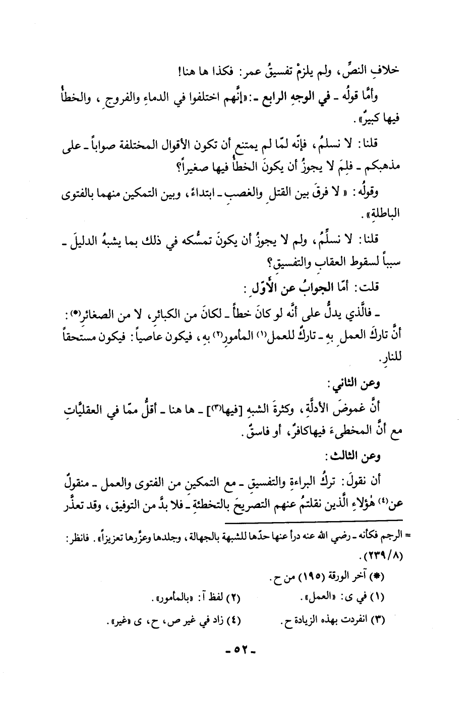 خلاف النص ولم يلزم تفسيق عمر فكذا ها هنا وأما قوله في الوجه الرابع إنهم اختلفوا في الدماء والفروج والخطأ فيها كبير قلنا لا نسلم فإنه لما لم يمتنع أن تكون الأقوال المختلفة صوابا على مذهبكم فلم لا يجوز أن يكون الخطأ فيها صغيرا وقوله لا فرق بين القتل والغصب ابتداء وبين التمكين منهما بالفتوى الباطلة قلنا لا نسلم ولم لا يجوز أن يكون تمسكه في ذلك بما يشبه الدليل سببا لسقوط العقاب والتفسيق قلت أما الجواب عن الأول فالذي يدل على أنه لو كان خطأ لكان من الكبائر لا من الصغائر أن تارك العمل به تارك للعمل المأمور به فيكون عاصيا فيكون مستحقا للنار وعن الثاني أن غموض الأدلة وكثرة الشبه فيها ها هنا أقل مما في العقليات مع أن المخطئ فيها كافر أو فاسق وعن الثالث أن نقول ترك البراءة والتفسيق مع التمكين من الفتوى والعمل منقول