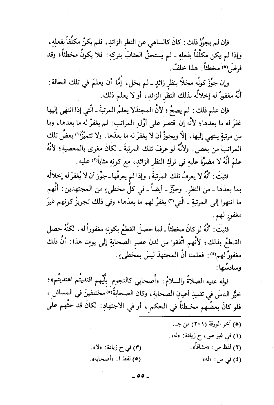 فإن لم يجوز ذلك كان كالساهي عن النظر الزائد فلم يكن مكلفا بفعله وإذا لم يكن مكلفا بفعله لم يستحق العقاب بتركه فلا يكون مخطئا وقد فرض مخطئا هذا خلف وإن جوز كونه مخلا بنظر زائد لم يخل إما أن يعلم في تلك الحالة أنه مغفور له إخلاله بذلك النظر الزائد أو لا يعلم ذلك فإن علم ذلك لم يصح لأن المجتهد لا يعلم المرتبة التي إذا انتهى إليها غفر له ما بعدها لأنه إن اقتصر على أول المراتب لم يغفر له ما بعدها وما من مرتبة ينتهي إليها إلا ويجوز أن لا يغفر له ما بعدها ولا تتميز بعض تلك المراتب من بعض ولأنه لو عرف تلك المرتبة لكان مغري بالمعصية لأنه علم أنه لا مضرة عليه في ترك النظر الزائد مع كونه مثابا عليه