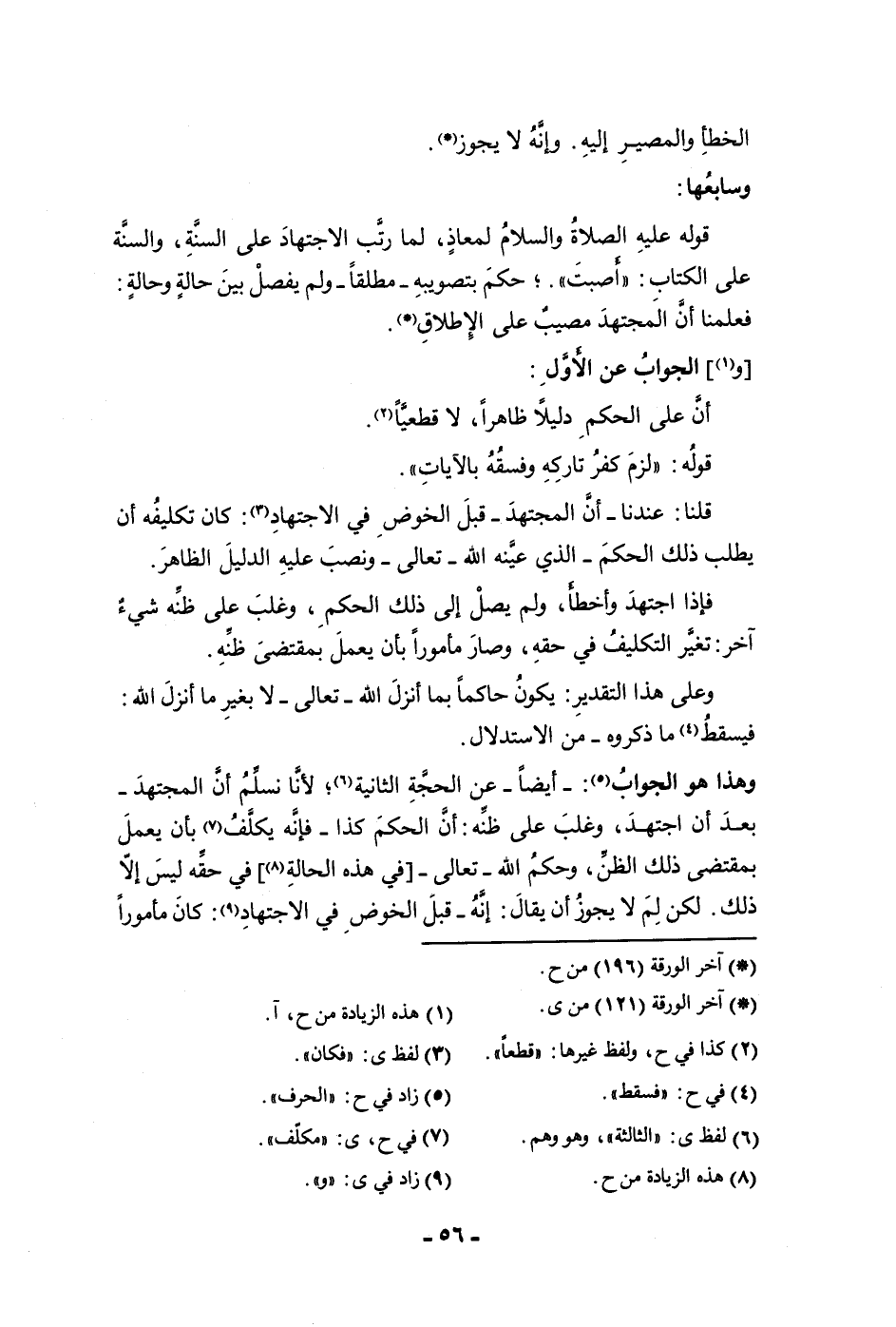الخطأ والمصير إليه وأنه لا يجوز وسابعها قوله عليه الصلاة والسلام لمعاذ لما رتب الاجتهاد على السنة والسنة على الكتاب أصبت حكم بتصويبه مطلقا ولم يفصل بين حالة وحالة فعلمنا أن المجتهد مصيب على الإطلاق والجواب عن الأول أن على الحكم دليلا ظاهرا لا قطعيا قوله لزم كفر تاركه وفسقه بالآيات قلنا عندنا أن المجتهد قبل الخوض في الاجتهاد كان تكليفه أن يطلب ذلك الحكم الذي عينه الله تعالى ونصب عليه الدليل الظاهر