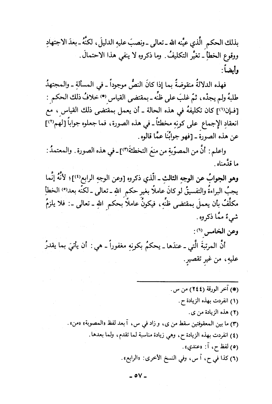 بذلك الحكم الذي عينه الله تعالى ونصب عليه الدليل لكنه بعد الاجتهاد ووقوع الخطأ تغير التكليف وما ذكروه لا ينفي هذا الإحتمال وأيضا فهذه الدلالة منقوضة بما إذا كان النص موجودا في المسألة والمجتهد طلبه ولم يجده ثم غلب على ظنه بمقتضى القياس خلاف ذلك الحكم فإن كان تكليفه في هذه الحالة أن يعمل بمقتضى ذلك القياس مع انعقاد الإجماع على كونه مخطئا في هذه الصورة فما جعلوه جوابا لهم عن هذه الصورة فهو جوابنا عما قالوه واعلم أن من المصوبة من منع التخطئة في هذه الصورة والمعتمد ما قدمناه وهو الجواب عن الوجه الثالث الذي ذكروه وعن الوجه الرابع لأنه إنما يجب البراءة والتفسيق لو كان عاملا بغير حكم الله تعالى لكنه بعد الخطأ مكلف بأن يعمل بمقتضى ظنه فيكون عاملا بحكم الله تعالى فلا يلزم