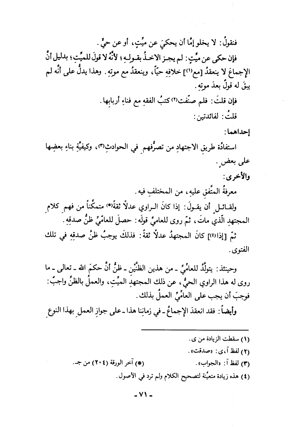 فنقول لا يخلوا إما أن يحكى عن ميت أو عن حي فإحكي لأنه عن ميت لم يجز الأخذ بقوله لأنه لا قول للميت بدليل أن الإجماع لا ينعقد مع خلافه حيا وينعقد مع موته وهذا يدل على أنه لم يبق له قول بعد موته فإن قلت فلم صنفت كتب الفقه مع فناء أربابها قلت لفائدتين إحداهما استفادة طريق الاجتهاد من تصرفهم في الحوادث وكيفية بناء بعضها على بعض والأخرى معرفة المتفق عليه من المختلف فيه ولقائل أن يقول اذا كان الراوي عدلا ثقة متمكنا من فهم كلام المجتهد الذي مات ثم روى للعامي قوله حصل للعامي ظن صدقه ثم إذا كان المجتهد عدلا ثقة فذلك يوجب ظن صدقه في تلك الفتوى وحينئذ يتولد للعامي من هذين الظنين ظن أن حكم الله تعالى ما روى له هذا الراوى الحي عن ذلك المجتهد الميت والعمل بالظن واجب
