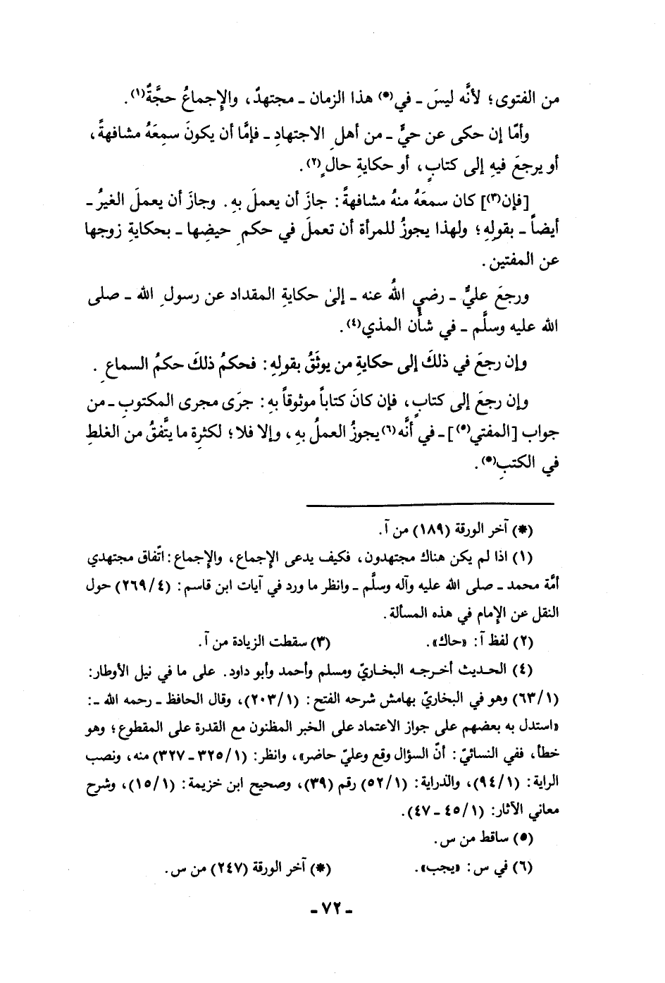 من الفتوى لأنه ليس في هذا الزمان مجتهد والإجماع حجة وأما إن حكى عن حي من أهل الاجتهاد فإما أن يكون سمعه مشافهة أو يرجع فيه إلى كتاب أو حكاية حال فإن كان سمعه منه مشافهة جاز أن يعمل به وجاز أن يعمل الغير أيضا بقوله ولهذا يجوز للمرأة أن تعمل في حكم حيضها بحكاية زوجها عن المفتين ورجع علي رضي الله عنه إلى حكاية المقداد عن رسول الله ص في شأن المذي وإن رجع في ذلك إلى حكاية من يوثق بقوله فحكم ذلك حكم السماع وإن رجع إلى كتاب فإن كان كتابا موثوقا به جرى مجرى المكتوب من جواب المفتي في أنه يجوز العمل به وإلا فلا لكثرة ما يتفق من الغلط في الكتب