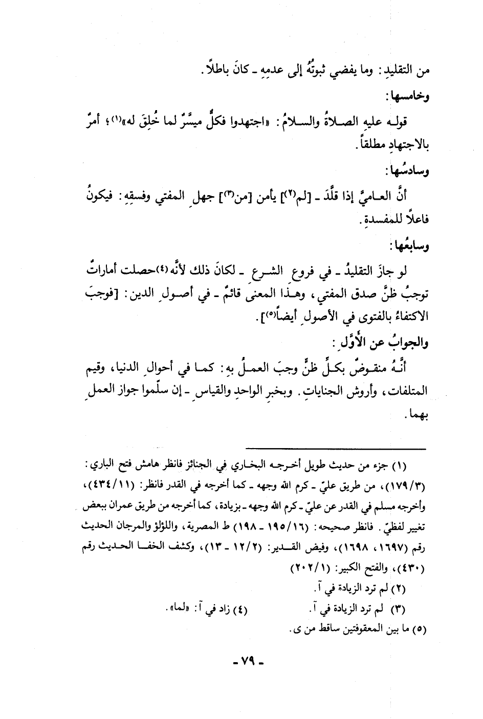 من التقليد وما يفضي ثبوته إلى عدمه كان باطلا وخامسها قوله عليه الصلاة والسلام اجتهدوا فكل ميسر لما خلق له أمر بالإجتهاد مطلقا وسادسها أن العامي إذا قلد لم يأمن من جهل المفتي وفسقه فيكون فاعلا للمفسدة وسابعها لو جاز التقليد في فروع الشرع لكان ذلك لأنه حصلت أمارات توجب ظن صدق المفتي وهذا المعنى قائم في أصول الدين فوجب الاكتفاء بالفتوى في الأصول أيضا والجواب عن الأول أنه منقوض بكل ظن وجب العمل به كما في أحوال الدنيا وقيم المتلفات وأروش الجنايات وبخبر الواحد والقياس إن سلموا جواز العمل بهما