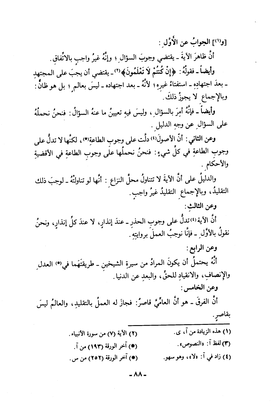 والجواب عن الأول أن ظاهر الآية يقتضي وجوب السؤال وإنه غير واجب بالاتفاق وأيضا فقوله إن كنتم لا تعلمون يقتضي أن يجب على المجتهد بعد اجتهاده استفتاء غيره لأنه بعد اجتهاده ليس بعالم بل هو ظان وبالإجماع لا يجوز ذلك وأيضا فإنه أمر بالسؤال وليس فيه تعيين ما عنه السؤال فنحن نحمله على السؤال عن وجه الدليل وعن الثاني أن الأصول دلت على وجوب الطاعة لكنها لا تدل على وجوب الطاعة في كل شئ فنحن نحملها على وجوب الطاعة في الأقضية
