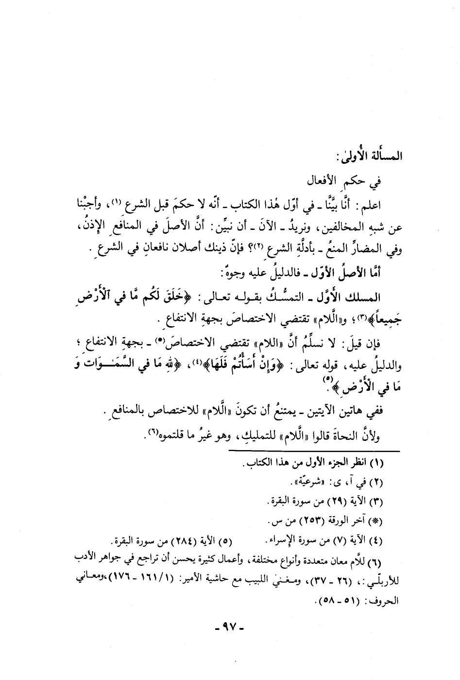 المسألة الأولى في حكم الأفعال اعلم أنا بينا في أول هذا الكتاب أنه لا حكم قبل الشرع وأجبنا عن شبه المخالفين ونريد الآن أن نبين أن الأصل في المنافع الإذن وفي المضار المنع بأدلة الشرع فإن ذينك أصلان نافعان في الشرع أما الأصل الأول فالدليل عليه وجوه المسلك الأول التمسك بقوله تعالى خلق لكم ما في الأرض جميعا واللام تقتضي الاختصاص بجهة الانتفاع فإن قيل لا نسلم أن اللام تقتضي الاختصاص بجهة الانتفاع والدليل عليه قوله تعالى وإن أسأتم فلها لله ما في السماوات والأرض ففي هاتين الآيتين يمتنع أن تكون اللام للاختصاص بالمنافع ولأن النحاة قالوا اللام للتمليك وهو غير ما قلتموه
