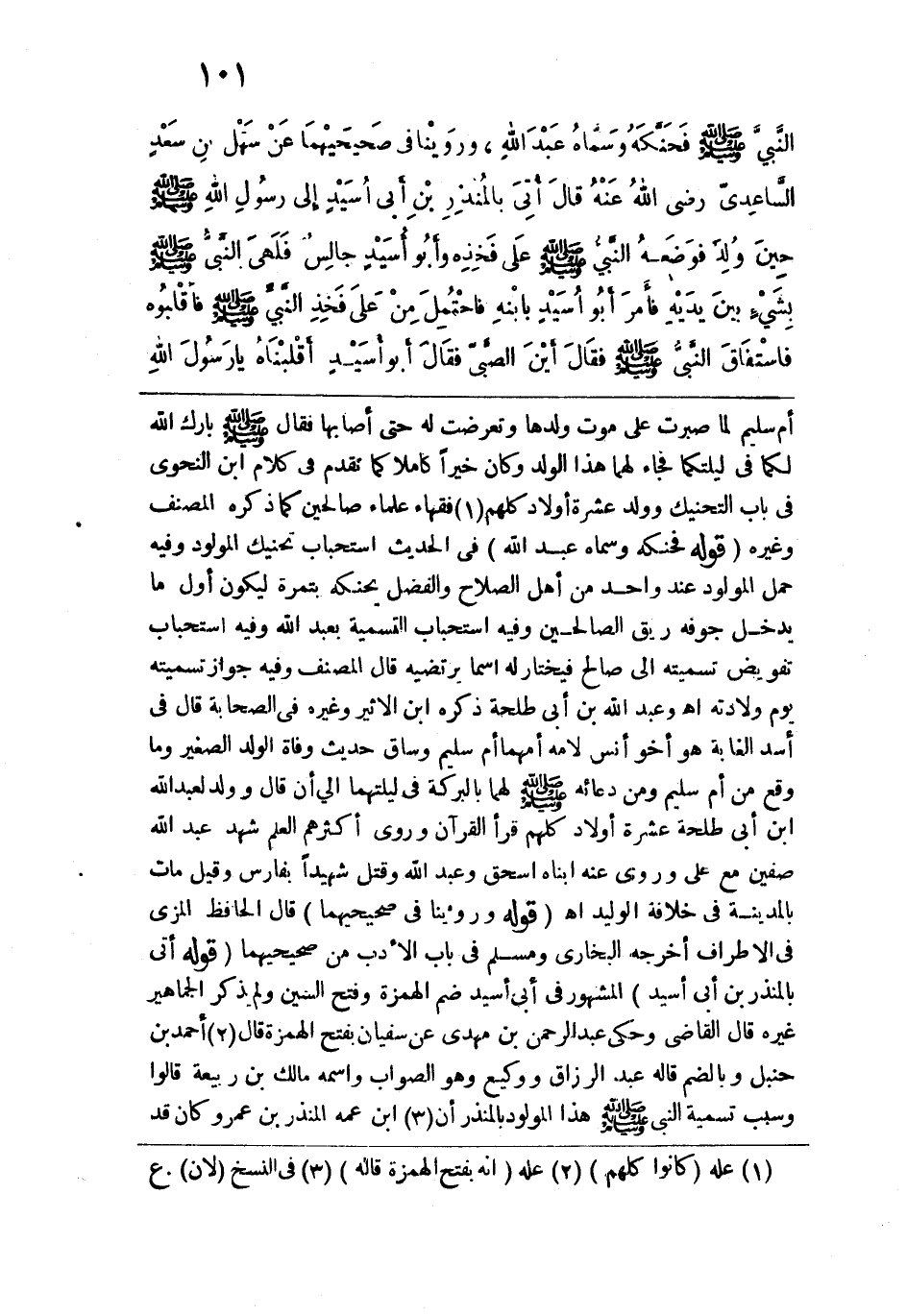 وروينا في "صحيحيهما" عن سهل بن سعد الساعدي رضي الله عنه قال: "أتيَ بالمنذر بن أبي أُسَيْد إلى رسول الله -صلى الله عليه وسلم- حين ولد، فوضعه النبي -صلى الله عليه وسلم- على فخذه وأبو أُسيد جالس، فَلَهِيَ النبي -صلى الله عليه وسلم- بشيءٍ بين يديه، فأمر أبو أسيد بابنه فاحتُمل من على فخذ النبي -صلى الله عليه وسلم-، فأَقْلبُوه، فاستفاق النبي -صلى الله عليه وسلم- فقال: أيْنَ الصَّبِي؟ فقال أبو أسَيْد: أقْلَبْناه يا رسول الله،