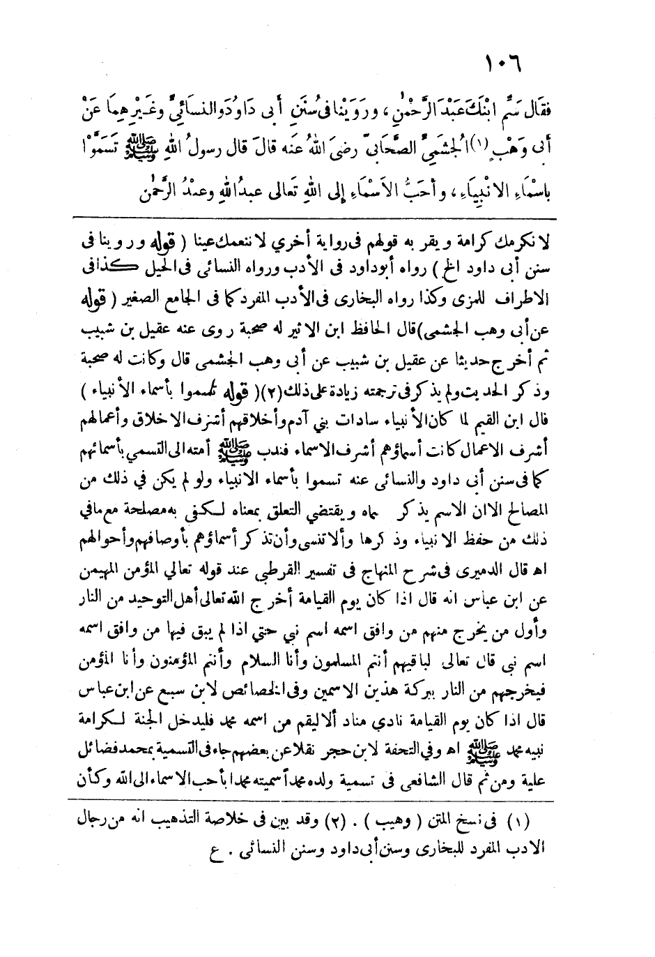 قوله: (وروينا في سنن أبي داود الخ) رواه أبو داود في الأدب ورواه النسائي في الحيل كذا في الأطراف للمزي وكذا رواه البخاري في الأدب المفرد كما في الجامع الصغير. قوله: (عن أبي وهب الجشمي (قال الحافظ ابن الأثير له صحبة روى عنه عقيل بن شبيب ثم أخرج حديثاً عن عقيل بن شبيب عن أبي وهب الجشمي قال: وكانت له صحبة وذكر الحديث ولم يذكر في ترجمته زيادة على ذلك. قوله: (تسموا بأسماء الأنبياء) قال ابن القيم: لما كان الأنبياء سادات بني آدم وأخلاقهم أشرف الأخلاق وأعمالهم أشرف الأعمال كانت أسماؤهم أشرف الأسماء فندب -صلى الله عليه وسلم- أمته إلى التسمي بأسمائهم كما في سنن أبي داود والنسائي عنه تسموا بأسماء الأنبياء ولو لم يكن في ذلك من المصالح إلا أن الاسم يذكر بمسماه ويقتضي التعلق بمعناه لكفى به مصلحة مع ما في ذلك من حفظ الأنبياء وذكرها وألا تنسى وأن تذكر أسماؤهم بأوصافهم وأحوالهم اهـ. قال الدميري في شرح المنهاج في تفسير القرطبي عند قوله تعالى المؤمن المهيمن عن ابن عباس أنه قال إذا كان يوم القيامة أخرج الله تعالى أهل التوحيد من النار وأول من يخرج منهم من وافق اسمه اسم نبي حتى إذا لم يبق فيها من وافق اسمه اسم نبي قال تعالى لباقيهم: أنتم المسلمون وأنا السلام وأنتم المؤمنون وأنا المؤمن فيخرجهم من النار ببركة هذين الاسمين وفي الخصائص لابن سبع عن ابن عباس قال: إذا كان يوم