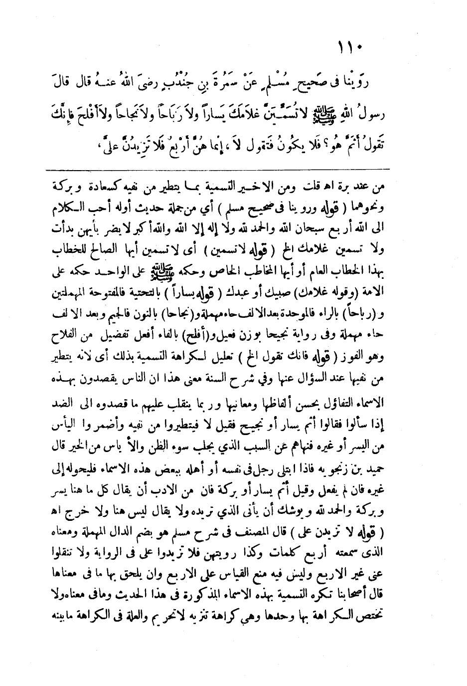 روينا في "صحيح مسلم" عن سمرة بن جندب رضي الله عنه قال: قال رسول الله -صلى الله عليه وسلم-: "لا تُسَمِّيَنَّ غُلامَكَ يَساراً، ولا رَباحاً، ولا نَجاحاً، ولا أفْلَحَ، فإنَّكَ تَقُولُ: أثَمَّ هُوَ؟ فَلا يَكُونُ، فَتَقُولُ: لا، إنَّما هُنَّ أرْبَعٌ فَلا تَزِيدُنَّ عَليَّ".