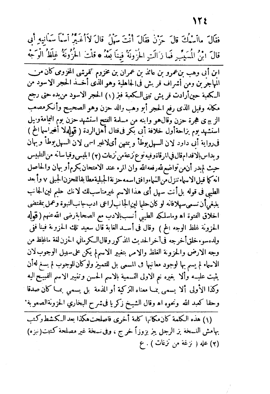 ابن أبي وهب بن عمرو بن عائذ بن عمران بن مخزوم القرشي المخزومي كان من المهاجرين ومن أشراف قريش في الجاهلية وهو الذي أخذ الحجر الأسود من الكعبة حين أرادت قريش تبني الكعبة فبز الحجر الأسود من يده حتى رجع مكانه وقيل الذي رفع الحجر أبو وهب والد حزن وهو الصحيح وأنكر مصعب الزبيري هجرة حزن وقال: هو وابنه من مسلمة الفتح استشهد حزن يوم اليمامة وقيل: استشهد يوم بزاحة أول خلافة أبي بكر في قتال أهل الردة. قوله: (لا أغير اسماً الخ) في رواية أبي داود لأن السهل يوطأ ويمتهن أي لا غير اسمي لأن السهل يوطأ ويهان ويداس بالأقدام قال في المرقاة وفيه نوع نزعة من نزعات إبليس وقياساته من التلبيس حيث لم يدر أن من تواضع الله رفعه الله وأن المرء عند الامتحان يكرم أو يهان والحاصل إنه كما قيل الأسماء تنزول من السماء وافق اسمه حزنة الجبلية مطابقاً للحزن الجبلي وأبعد الطيبي في قوله: بل أنت سهل أي هذا الاسم غير مناسب لك لأنك حليم لين الجانب ينبغي أن تسمى سهلاً فإنه لو كان حليماً لين الجانب لراعى أدب جانب النبوة وعمل بمقتضى أخلاق الفتوة اهـ. وما سلكه الطيبي أنسب بالأدب مع الصحابة رضي الله عنهم. قوله: (الحزونة غلظ الوجه الخ) وقال في أسد الغابة قال سعيد تلك الحزونة فينا ففي ولده سوء خلق أخرجه في آخر الحديث المذكور وقال الكرماني الحزن لغة ما غلظ من وجه الأرض والحزونة الغلظ والأمر بتغيير الاسم لم يكن على سبيل الوجوب لأن الأسماء لم يسم بها لوجود معانيها في المسمى بل للتمييز ولو كان للوجوب لم يسغ له أن يثبت عليه وألا بغيره نعم الأولى التسمية بالاسم الحسن وتغيير الاسم القبيح إليه وكذا الأولى ألا يسمى بما معناه التزكية أو المذمة بل يسمى بما كان صدقاً وحقاً كعبد الله ونحوه اهـ. وقال الشيخ زكريا في شرح البخاري الحزونة الصعوبة