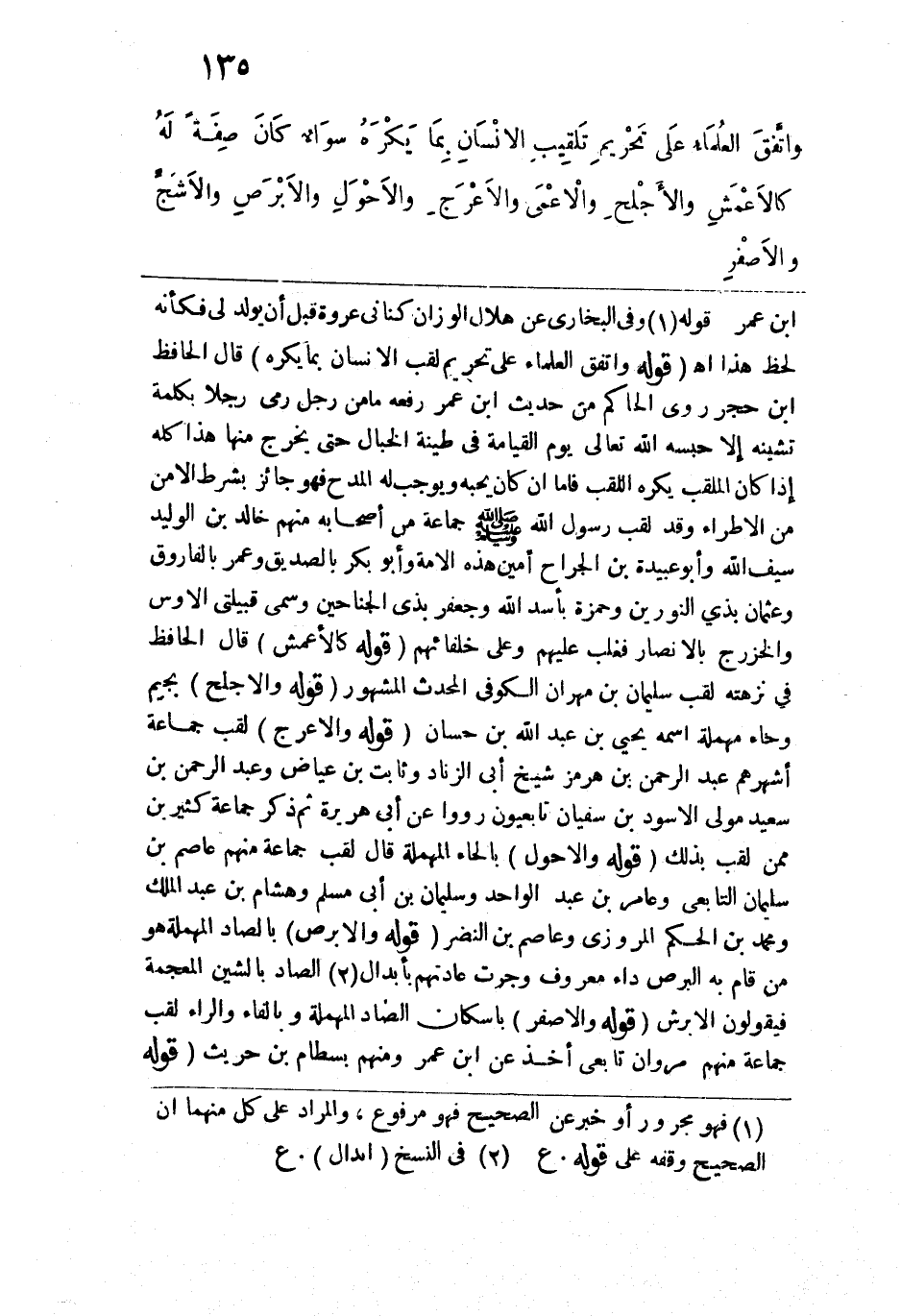 ابن عمر قوله: وفي البخاري عن هلال الوزان كناني عروة قبل أن يولد لي فكأنه لحظ هذا اهـ. قوله: (واتفق العلماء على تحريم لقب الإنسان بما يكره) قال الحافظ ابن حجر روى الحاكم من حديث ابن عمر رفعه ما من رجل رمى رجلاً بكلمة تشينه إلا حبسه الله تعالى يوم القيامة في طينة الخبال حتى يخرج منها هذا كله إذا كان الملقب يكره اللقب فأما إن كان يحبه ويوجب له المدح فهو جائز بشرط الأمن من الإطرا وقد لقب رسول الله -صلى الله عليه وسلم- جماعة من أصحابه منهم خالد بن الوليد سيف الله وأبو عبيدة بن الجراح أمين هذه الأمة وأبو بكر بالصديق وعمر بالفاروق وعثمان بذي النورين وحمزة بأسد الله وجعفر بذي الجناحين وسمى قبيلتي الأوس والخزرج بالأنصار فغلب عليهم وعلى خلفائهم. قوله: (كالأعمش) قال الحافظ في نزهته لقب سليمان بن مهران الكوفي المحدث المشهور. قوله: (والأجلح) بجيم وحاء مهملة اسمه يحيى بن عبد الله بن حسان. قوله: (والأعرج) لقب جماعة أشهرهم عبد الرحمن بن هرمز شيخ أبي الزناد وثابت بن عياض وعبد الرحمن بن سعيد مولى الأسود بن سفيان تابعيون رووا عن أبي هريرة ثم ذكر جماعة كثيرين ممن لقب بذلك. قوله: (والأحوال) بالحاء المهملة قال: لقب جماعة منهم عاصم بن سليمان التابعي وعامر بن عبد الواحد وسليمان بن أبي مسلم وهشام بن عبد الملك ومحمد بن الحكم المروزي وعاصم بن النضر. قوله: (والأبرص) بالصاد المهملة هو من قام به البرص داء معروفة وجرت عادتهم بأبدال الصاد بالشين المعجمة فيقولون الأبرش. قوله: (والأصفر) بإسكان الصاد المهملة وبالفاء والراء لقب جماعة منهم مروان تابعي أخذ عن ابن عمر ومنهم بسطام بن حريث. قوله: