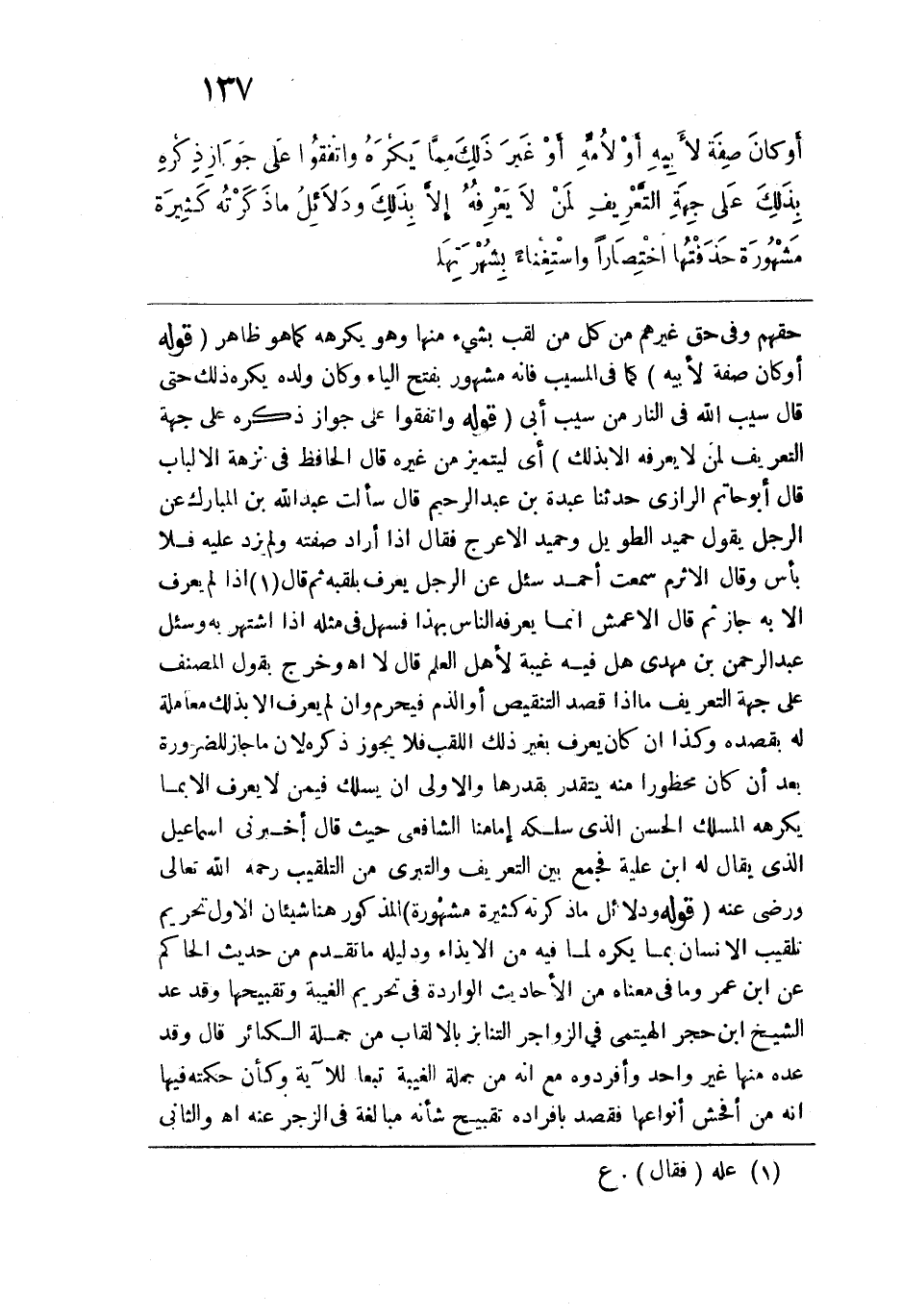 أو كان صفة لأبيه أو لأمه أو غير ذلك مما يكره، واتفقوا على جواز ذِكْرِه بذلك على جهة التعريف لمن لا يعرفه إلا بذلك، ودلائل ما ذكرته كثيرة مشهورة حذفتها اختصاراً واستغناءً بشهرتها.