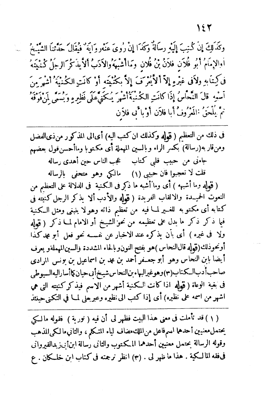 قوله: (وما أشبهه) أي وما أشبه ما ذكر في الكنية في الدلالة على التعظيم من النعوت الحميدة والألقاب الفريدة. قوله: (والأدب ألا يذكر الرجل كنيته في كتابه) أي مكتوبه للغير لما فيه من تعظيم ذاته وهو لا ينبغي ومثل الكنية فيما ذكر ذكر ما يدل على تعظيمه من نحو الشيخ أو الإِمام لما ذكر. قوله: (ولا في غيره) أي بأن يذكره عند الإخبار عن نفسه نحو فعل أبو محمد كذا أو نحو ذلك. قوله: (قال النحاس) هو بفتح النون وبالحاء المشددة والسين المهملة ويعرف أيضاً بابن النحاس وهو أبو جعفر أحمد بن محمد بن إسماعيل بن يونس المرادي صاحب أدب الكتاب وهو غير البهاء بن النحاس شيخ أبي حيان كما أشار إليه السيوطي في بغية الوعاة قوله: (إذا كانت الكنية أشهر من الاسم فيذكر كنيته التي هي أشهر من اسمه على نظيره) أي إذا كتب إلى نظيره وعبر بعلي لما في التكني