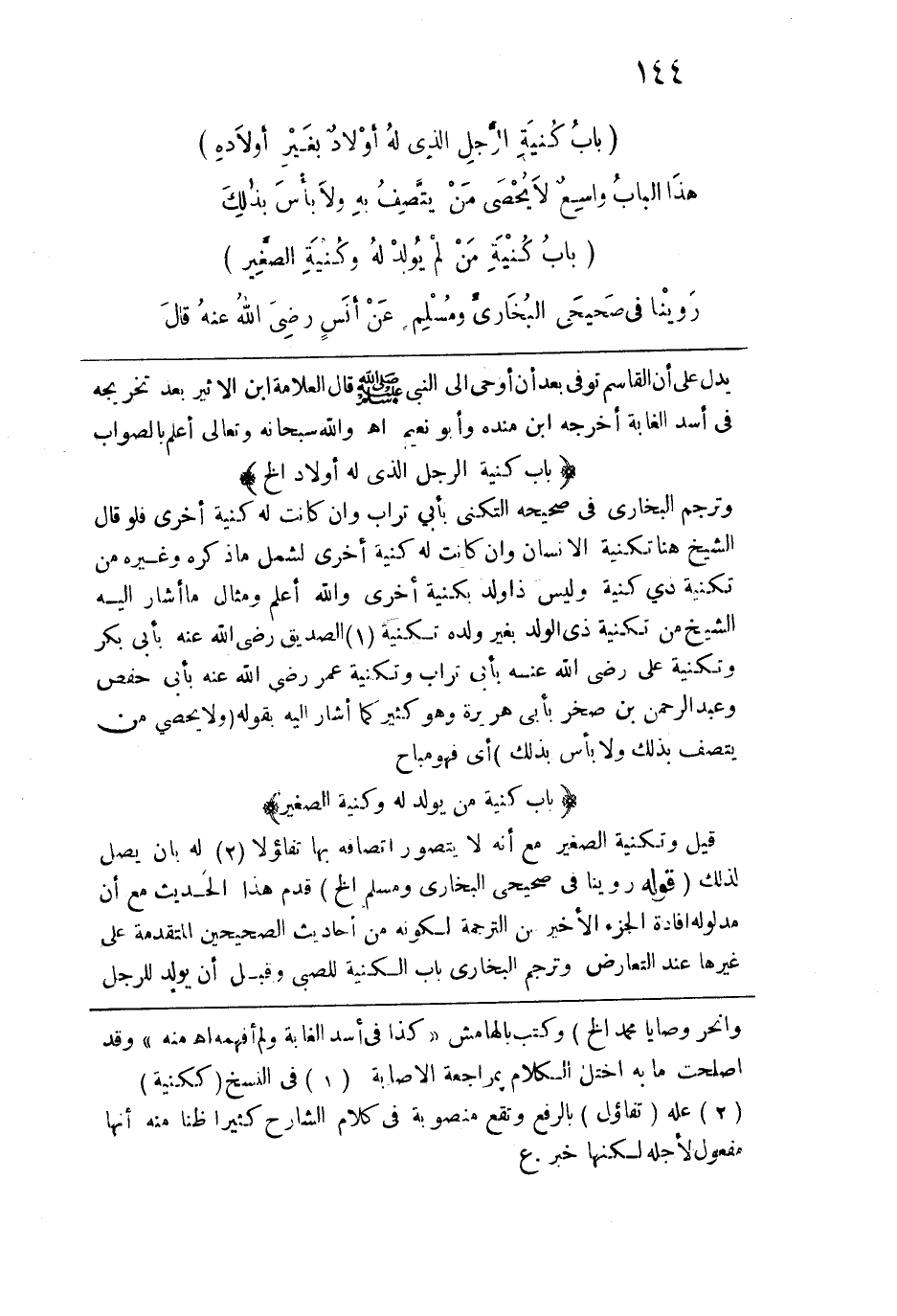 قيل وتكنية الصغير مع أنه لا يتصور اتصافه بها تفاؤلاً له بأن يصل لذلك. قوله: (روينا في صحيحي البخاري ومسلم الخ) قدم هذا الحديث مع أن مدلوله إفادة الجزء الأخير من الترجمة لكونه من أحاديث الصحيحين المتقدمة على غيرها عند التعارض وترجم البخاري باب الكنية للصبي وقيل إن يولد للرجل