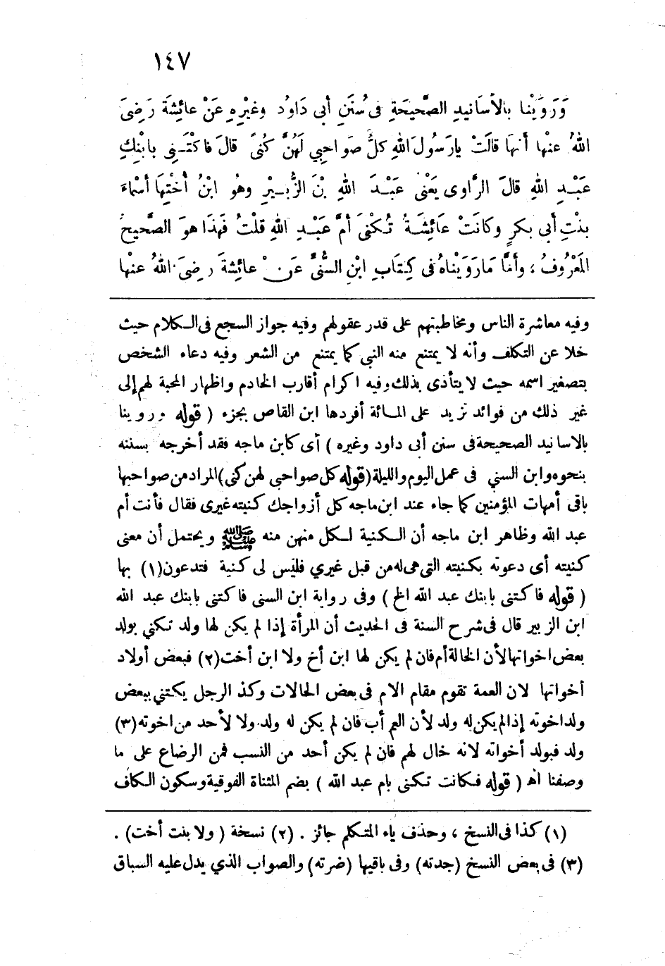 وفيه معاشرة النّاس ومخاطبتهم على قدر عقولهم وفيه جواز السجع في الكلام حيث خلا عن التكلف وأنه لا يمتنع منه النبي كما يمتنع من الشعر وفيه دعاء الشخص بتصغير اسمه حيث لا يتأذى بذلك وفيه إكرام أقارب الخادم وإظهار المحبة لهم إلى غير ذلك من فوائد تزيد على المائة أفردها ابن القاص بجزء. قوله: (وروينا بالأسانيد الصحيحة في سنن أبي داود وغيره) أي كابن ماجه فقد أخرجه بسننه بنحوه وابن السني في عمل اليوم والليلة. قوله: (كل صواحبي لهن كنى) المراد من صواحبها باقي أمهات المؤمنين كما جاء عند ابن ماجه كل أزواجك كنيته غيري فقال: أنت أم عبد الله وظاهر ابن ماجه أن الكنية لكل منهن منه -صلى الله عليه وسلم- ويحتمل أن معنى كنيته أي دعوته بكنيته التي هي له من قبل غيري فليس لي كنية فتدعون بها. قوله: (فاكتني بابنك عبد الله الخ) وفي رواية ابن السني فاكتني بابنك عبد الله بن الزبير قال في شرح السنة في الحديث أن المرأة إذا لم يكن لها ولد تكنى بولد بعض أخواتها لأن الخالة أم فإن لم يكن لها ابن أخ ولا ابن أخت فبعض أولاد أخواتها لأن العمة تقوم مقام الأم في بعض الحالات وكذا الرجل يكتني ببعض ولد إخوته إذا لم يكن له ولد لأن العم أب فإن لم يكن له ولد ولا لأحد من أخوته ولد فبولد أخواته لأنه خال لهم فإن لم يكن أحد من النسب فمن الرضاع على ما وصفنا اهـ. قوله: (فكانت تكنى بأم عبد الله) بضم المثناة الفوقية وسكون