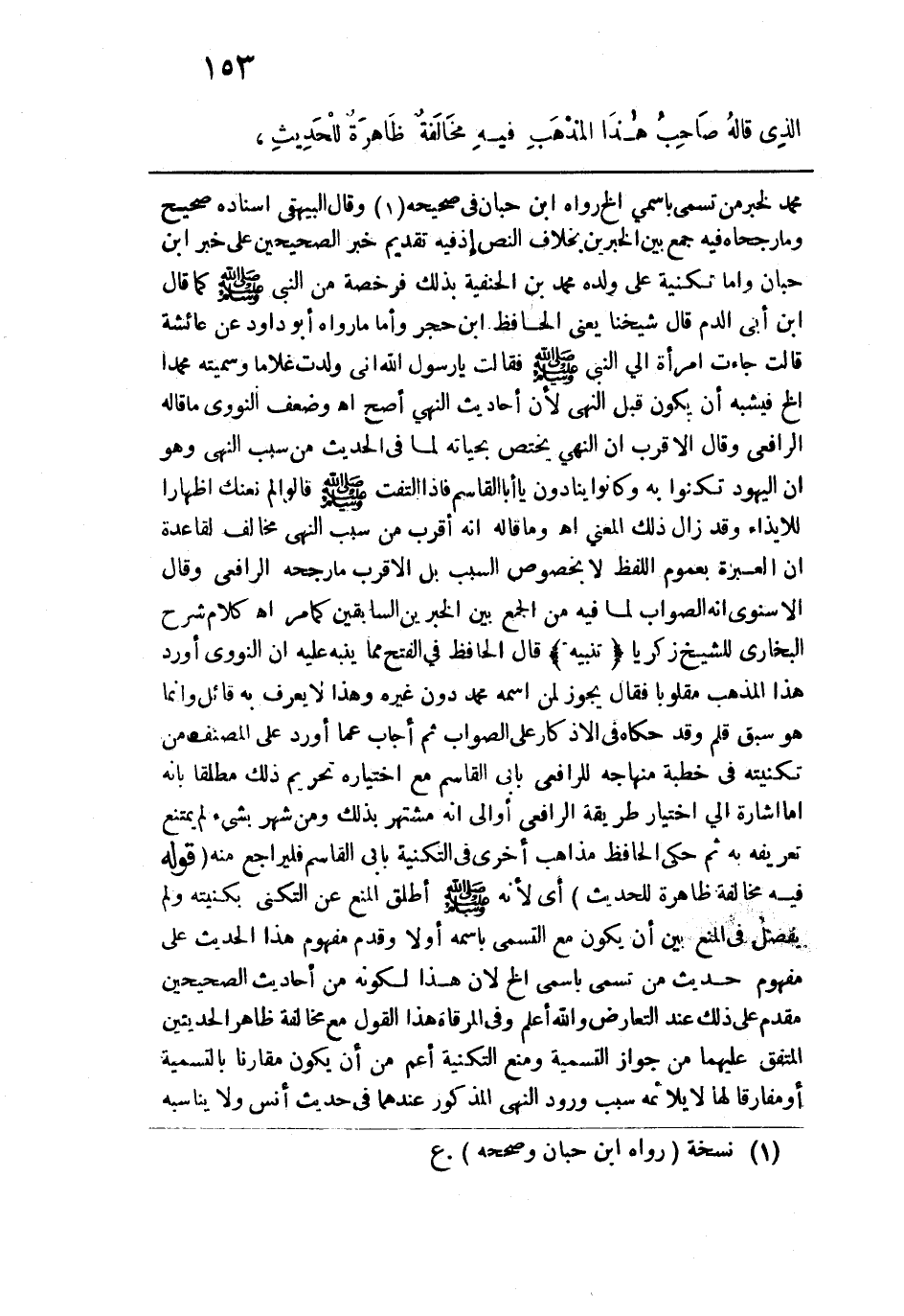محمد خبر من تسمى باسمي الخ رواه ابن حبان في صحيحه وقال البيهقي إسناده صحيح وما رجحاه فيه جمع بين الخبرين بخلاف النص إذ فيه تقديم خبر الصحيحين على خبر ابن حبان وأما تكنية علي ولده محمد ابن الحنفية بذلك فرخصة من النبي -صلى الله عليه وسلم- كما قال ابن أبي الدم قال شيخنا يعني الحافظ ابن حجر وأما ما رواه أبو داود عن عائشة قالت: جاءت امرأة إلى النبي -صلى الله عليه وسلم- فقالت: يا رسول الله إني ولدت غلاماً وسميته محمداً الخ فيشبه أن يكون قبل النهي لأن أحاديث النهي أصح اهـ، وضعف النووي ما قاله الرافعي وقال الأقرب: إن النهي يختص بحياته لما في الحديث من سبب النهي وهو إن اليهود تكنوا به وكانوا ينادون: يا أبا القاسم فإذا التفت -صلى الله عليه وسلم- قالوا: لم نعنك إظهاراً للإيذاء وقد زال ذلك المعنى اهـ، وما قاله إنه أقرب من سبب النهي مخالف لقاعدة إن العبرة بعموم اللفظ لا بخصوص السبب بل الأقرب ما رجحه الرافعي وقال الأسنوي: إنه الصواب لما فيه من الجمع بين الخبرين السابقين كما مر اهـ، كلام شرح البخاري للشيخ زكريا.