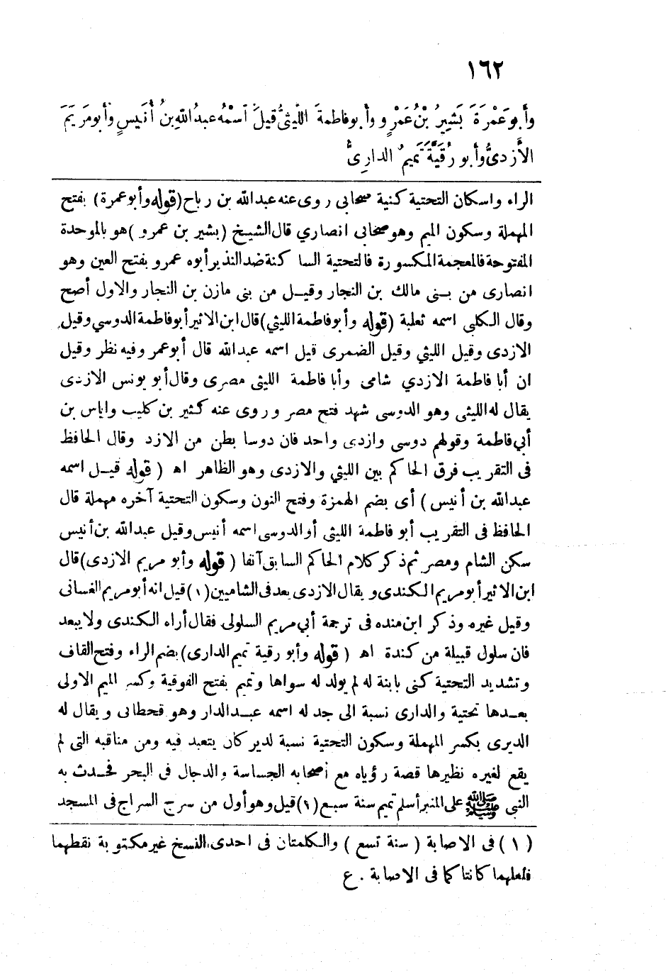 الراء وإسكان التحتية كنية صحابي روى عنه عبد الله بن رباح. قوله: (وأبو عمرة) بفتح المهملة وسكون الميم وهو صحابي أنصاري قال الشيخ (بشير بن عمرو) هو بالموحدة المفتوحة فالمعجمة المكسورة فالتحتية الساكنة ضد النذير أبوه عمرو بفتح العين وهو أنصاري من في مالك بن النجار وقيل: من بني مازن بن النجار والأول أصح وقال الكلبي اسمه ثعلبة. قوله: (وأبو فاطمة الليثي) قال ابن الأثير أبو فاطمة الدوسي وقيل الأزدي وقيل الليثي وقيل الضمري قيل اسمه عبد الله قال أبو عمر وفيه نظر وقيل إن أبا فاطمة الأزدي شامي وأبا فاطمة الليثي مصري وقال أبو يونس الأزدي يقال له: الليثي وهو الدوسي شهد فتح مصر وروى عنه كثير بن كليب وإياس بن أبي فاطمة وقولهم دوسي وأزدي واحد فإن دوساً بطن من الأزد وقال الحافظ في التقريب فرق الحاكم بين الليثي والأزدي وهو الظاهر اهـ. قوله: (قيل اسمه عبد الله بن أنيس) أي بضم الهمزة وفتح النون وسكون التحتية آخره مهملة قال الحافظ في التقريب أبو فاطمة الليثي أو الدوسي اسمه أنيس وقيل: عبد الله بن أنيس سكن الشام ومصر ثم ذكر كلام الحاكم السابق آنفاً. قوله: (وأبو مريم الأزدي) قال ابن الأثير أبو مريم الكندي ويقال الأزدي يعد في الشاميين قيل: إنه أبو مريم الغساني وقيل: غيره وذكر ابن منده في ترجمة أبي مريم السلولي فقال: أراه الكندي ولا يبعد فإن سلول قبيلة من كندة اهـ. قوله: (وأبو رقية تميم الداري) بضم الراء وفتح القاف وتشديد التحتية كني بابنة له لم يولد له سواها وتميم بفتح الفوقية وكسر الميم الأولى بعدها تحتية والداري نسبة إلى جد له اسمه عبد الدار وهو قحطاني ويقال له: الديري بكسر المهملة وسكون التحتية نسبة لدير كان يتعبد فيه ومن مناقبه التي لم يقع لغيره نظيرها قصة رؤياه مع أصحابه الجساسة والدجال في البحر فحدث به النبي -صلى الله عليه وسلم- على المنبر أسلم تميم سنة سبع قيل: وهو أول من سرج السراج في المسجد